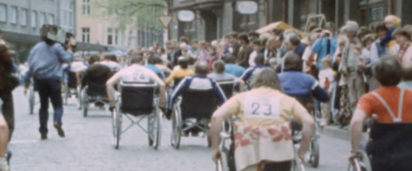 Ratastoolide võiduajamine Tallinna kesklinnas. Kaader Prillitoosi saatest, aastast 1987