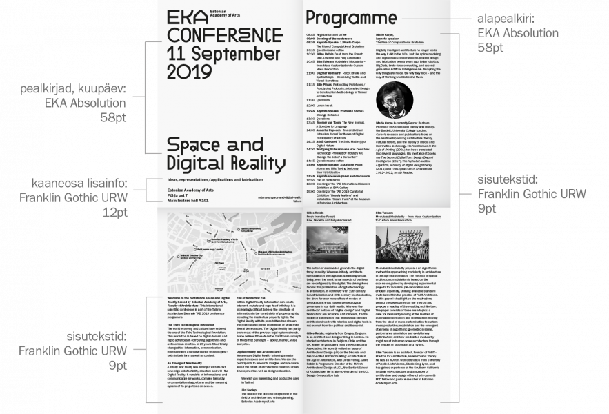 EKA Absolutionit kasutatakse pealkirjades, alapealkirjades, sündmuse kuupäevades jm esimese astme informatsioonis. Ülejäänud tekst ja lisainfo on Franklin Gothic URW fondis ning oluliselt väiksemas punktisuuruses (minimaalne punktisuuruste suhe 3:1).