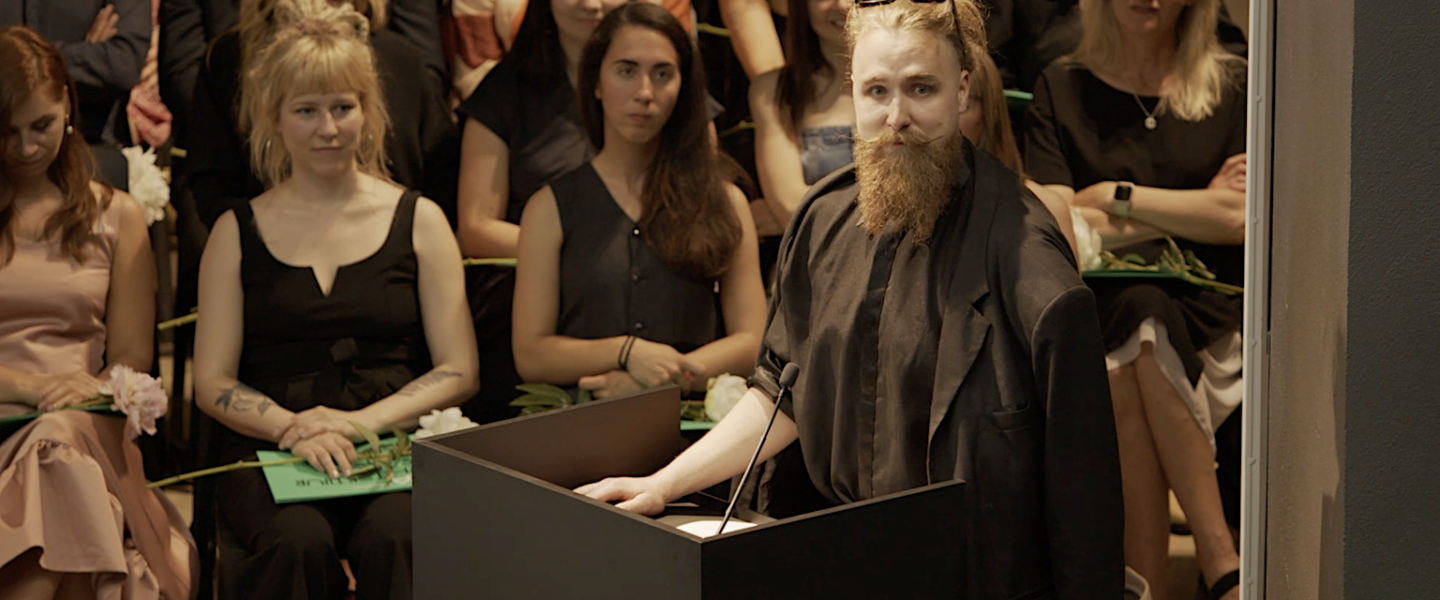 Lõpetajate nimel peab kõnet EKA ehte ja sepise eriala magister Taavi Teevet. Kuvatõmmis: EKA TV
