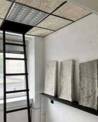 “Text in Stone” is an experimental material whose main component is glossy scrap paper – something that is produced and used in large quantities, but has limited prospects for reuse. To improve its properties, additives such as slaked lime and dry cement are used. Preliminary measurements suggest that, in addition to regulating air humidity, the material may also purify air from toxins, such as formaldehyde and volatile organic compounds. Although I am presenting a few possible ways the material could be used at TASE, my goal is not to introduce a specific product, but to raise a question: what if waste could have a new life and a positive effect on indoor climate? This work is an invitation to experiment, to doubt, and to rethink how we value materials we usually consider useless.