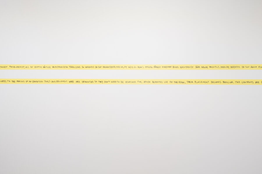 The project includes a spatial intervention that occupies the entire gallery, highlighting the spaces of EKA Gallery and its contents. The conceptual framework also includes the group exhibition “Field Notes from Immediate Proximity”, the curation of which Soodla entrusted to artist Riin Maide. This role-playing gesture treats the form of collaboration as a separate artwork.
