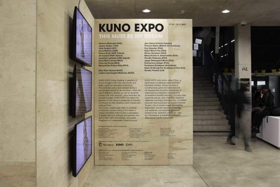 KUNO EXPO (THIS MUST BE MY DREAM / brings together a selection of recent works by students of Nordic and Baltic art universities. The works were created for art education in a difficult period, when the use of academy studios was difficult and the cooperation between students and lecturers was difficult. Assessing the contribution of all parties, the network’s faculty were challenged to recommend the students’ work that affected them and seemed important in the past. The works, often created in chamber conditions, bring to the viewer a new kind of new reality, where global self-irony, loneliness and sadness are perceived – as well as clarity of thought and a poetic imagination independent of the future horizon.