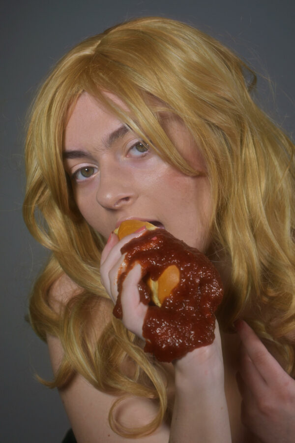 In this portrait, I embody the absurd hyper-sexualised ‘ideal’ woman portrayed in the media. The inspiration for creating this image came from Gillian Flynn’s novel ‘Gone Girl’ (2012). The protagonist describes her experience as a woman trying to be the perfect ‘cool girl’ stereotype her whole life. ‘Cool girl jams hot dogs into her mouth like she’s hosting the world’s biggest culinary gang bang.’