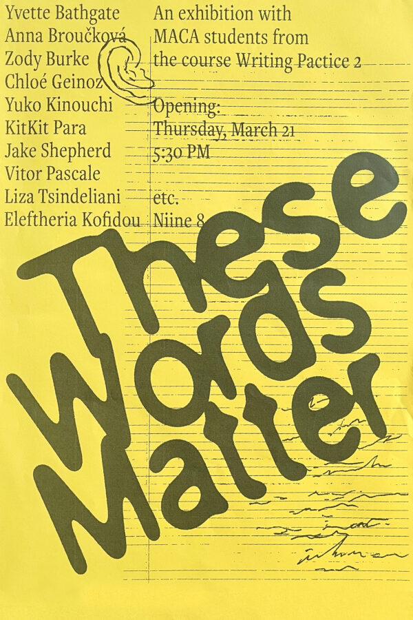 Opening of These Words Matter, an exhibition with MA Contemporary Art students from the course ‘Writing Practice 2’, supervised by Lieven Lahaye. The exhibition consists of new works about or conceived through writing. The title of the exhibition is lifted from Dodie Bellamy’s ‘Hoarding as écriture’.