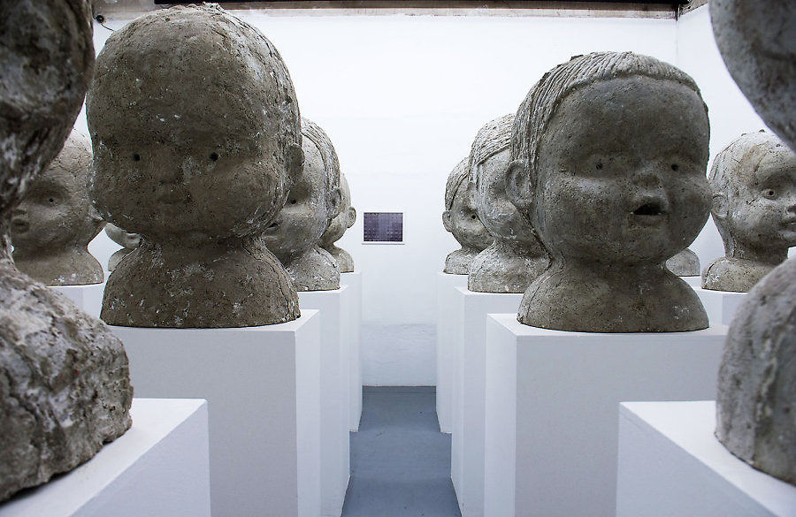 Kaselaan’s acclaimed work The Square of Dolls is a good example of monumentality squeezed into the gallery, as it consists of 16 huge doll heads cast in concrete accompanied by the series of photographs. The parallels with monumental art are triggered not only by the material and object to space ratio, but also by the fact that monuments are erected to tell and, more to the point, remind us of a story. In this case a story of dolls found next to a rubbish bin in the middle of a Soviet residential area, that itself is one of the last functioning monuments of an era.
