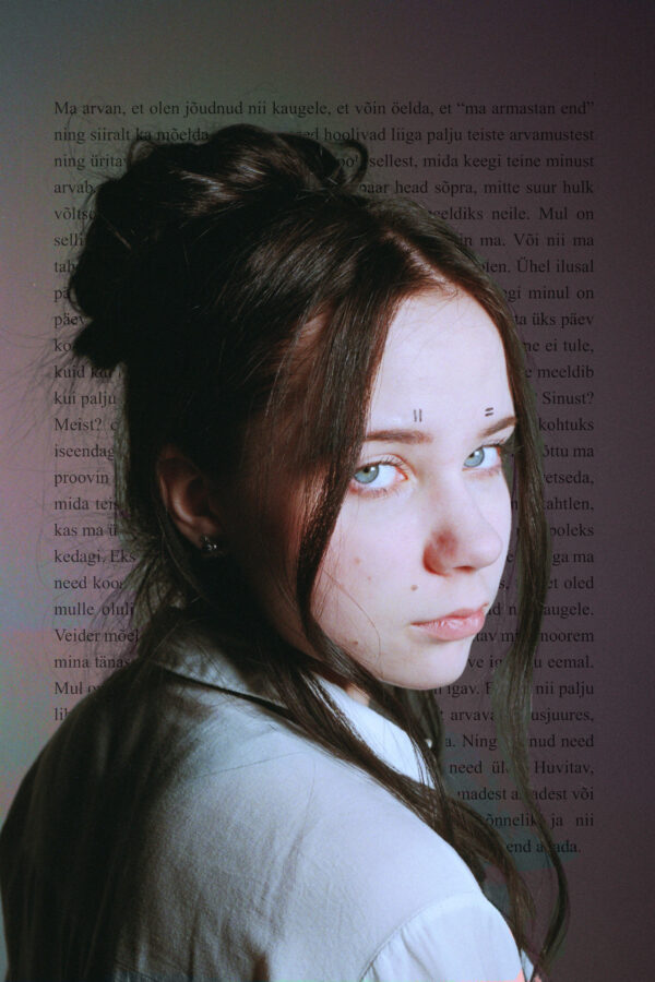 My work is made of two parts: the portrait of my sister and text in the background. The text has been taken from my sister’s diary entry. The portrait is detached from the background to emphasize that time has stopped and she exists in her own world. Sometimes you have to stand aside, to find a new perspective in order to move on. This makes it possible to admire life from a new aspect or to discover something new about oneself – something unique that could have been ignored before.