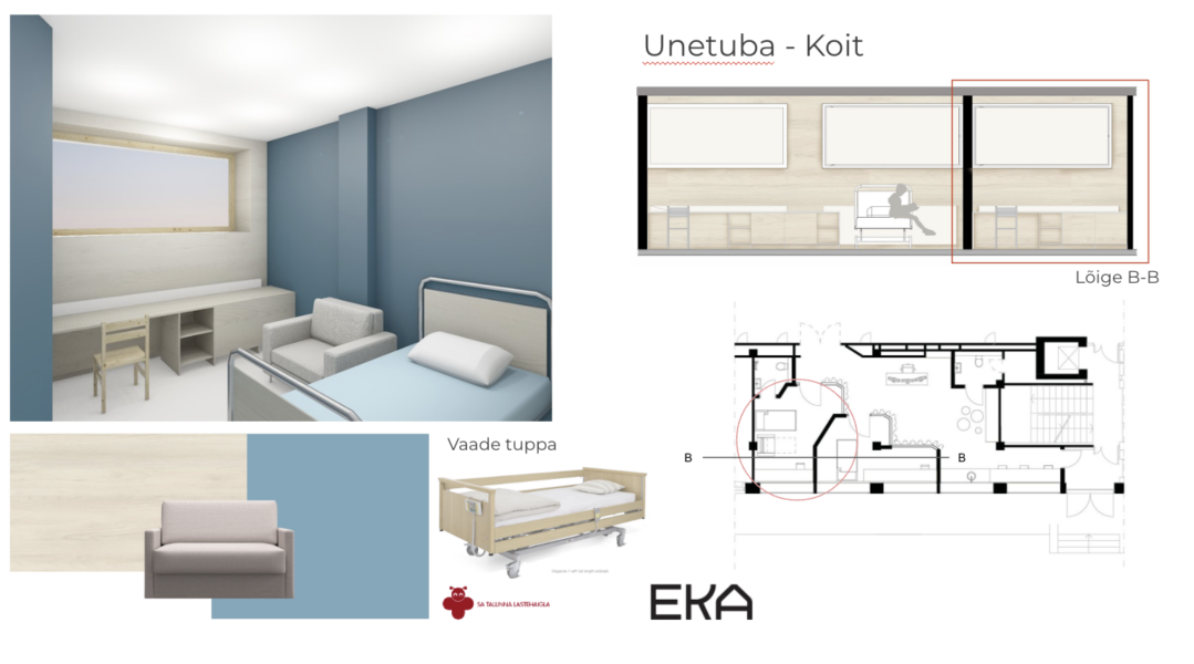 Children’s sleep disorders are studied at Tallinn Children’s Hospital, but the rooms where sleep studies are conducted are outdated and no longer meet the needs of children, their caregivers, or hospital staff. At the invitation of the Children’s Hospital and the Hospital Support Foundation, master’s students in interior architecture had an excellent opportunity to take sleep architecture apart, conceptualize a space that supports sleep studies, and propose solutions on how to create a new sleep study so that help can be provided as smoothly as possible.