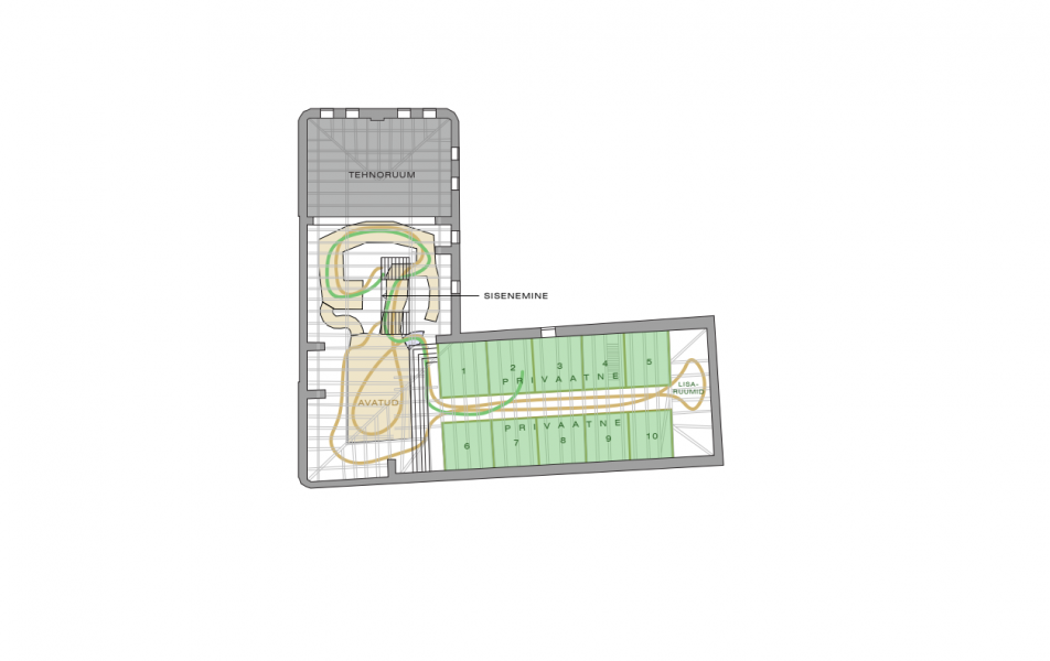 The attic is divided into three layers – open, semi-open and private. The attic as a whole forms a cross-section of the city’s structure. The open zone is similar to a city street – it is accessible to all people working in the building and offers an opportunity to take a break from thinking.
