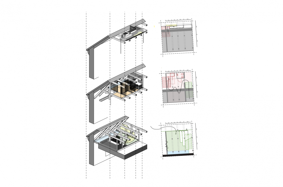 The attic is divided into an open space similar to a city street, inviting users to move around and take notice of new views. In the second wing are the three-storey rooms of the members of the crisis commission, which can be crossed along the central street. Each member of the commission has a garden on the ground floor, a personal room on the second floor and a common office space for the commission only on the third floor.