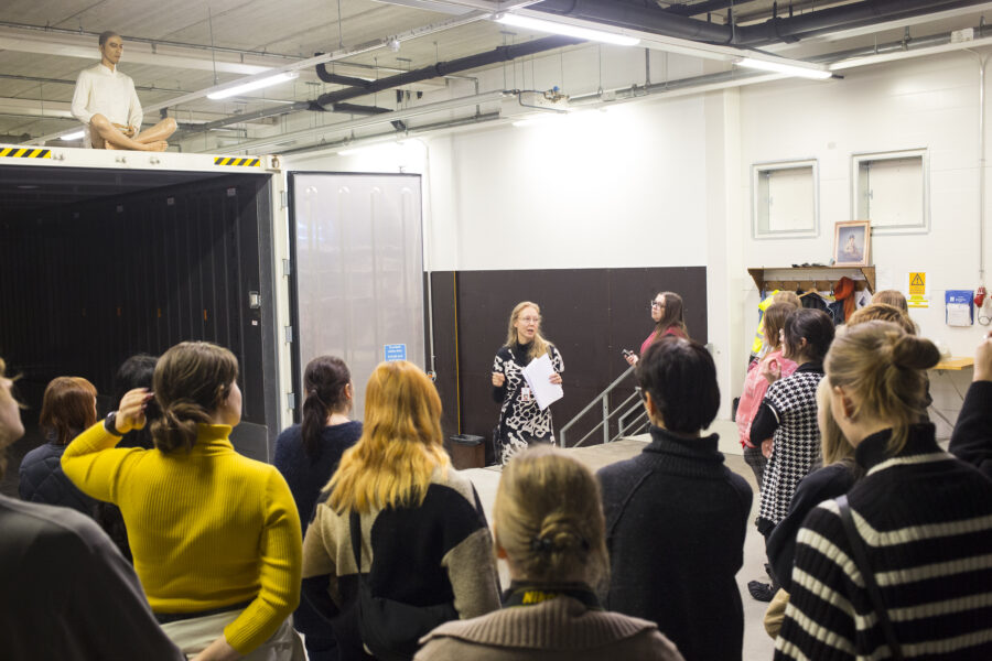 The study trip started with a visit to the collections of the National Museum of Finland. The collections were introduced by the intendant Katri Lahti, who is in charge of the logistical organisation of the museum’s collections, as well as conservation. She talked about the repatriation of cultural heritage in Finland and the Nordic countries, and about the return of Sami cultural heritage to the community, using the example of the National Museum of Finland. In 2021, the National Museum returned more than 2,000 objects to the Sámi Museum in Siida. A tour of the collections and a visit to the museum’s conservation department, where Maria Pommer, an alumna of the Estonian Academy of Arts, who is currently an intern there, spoke about her work.