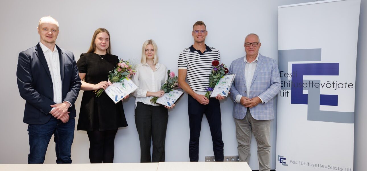 From left: Kalmer Gross, CEO of the Estonian Construction Entrepreneurs' Association, authors of the student works Marit Järviste, Marta Elisabeth Tikman and Vaido Vahter, and Jüri Rass, digital construction expert at the Ministry of Climate. Photo: Andras Kralla.