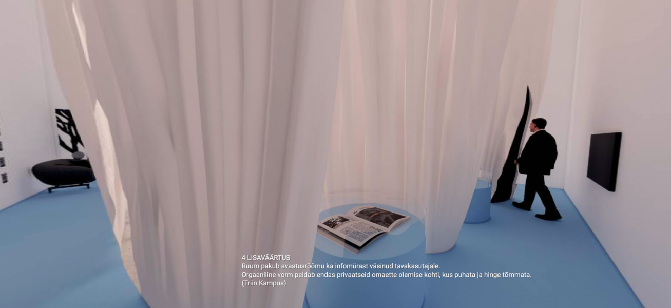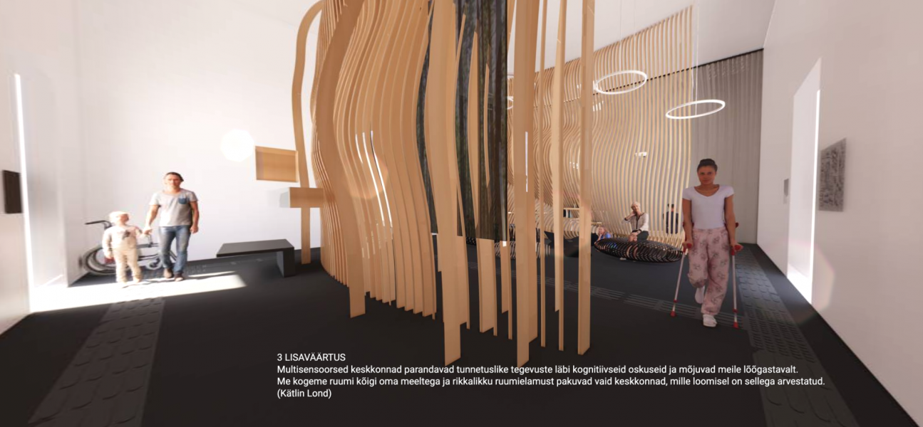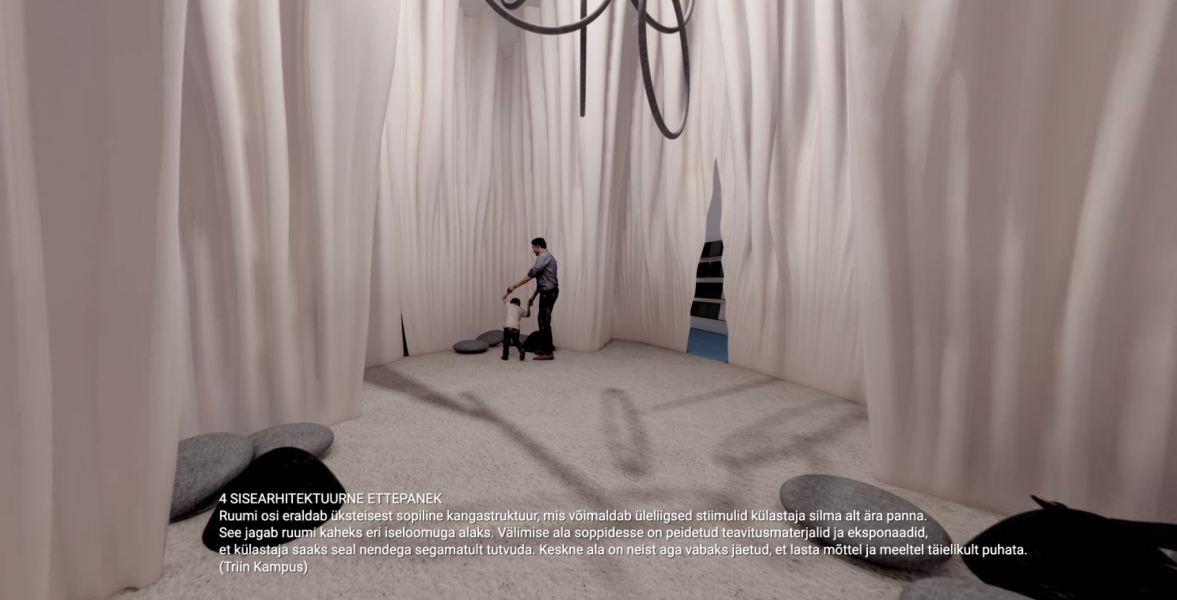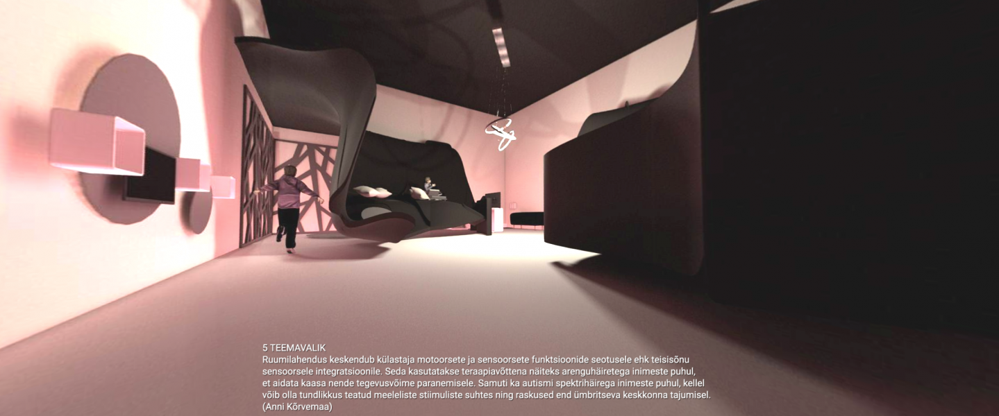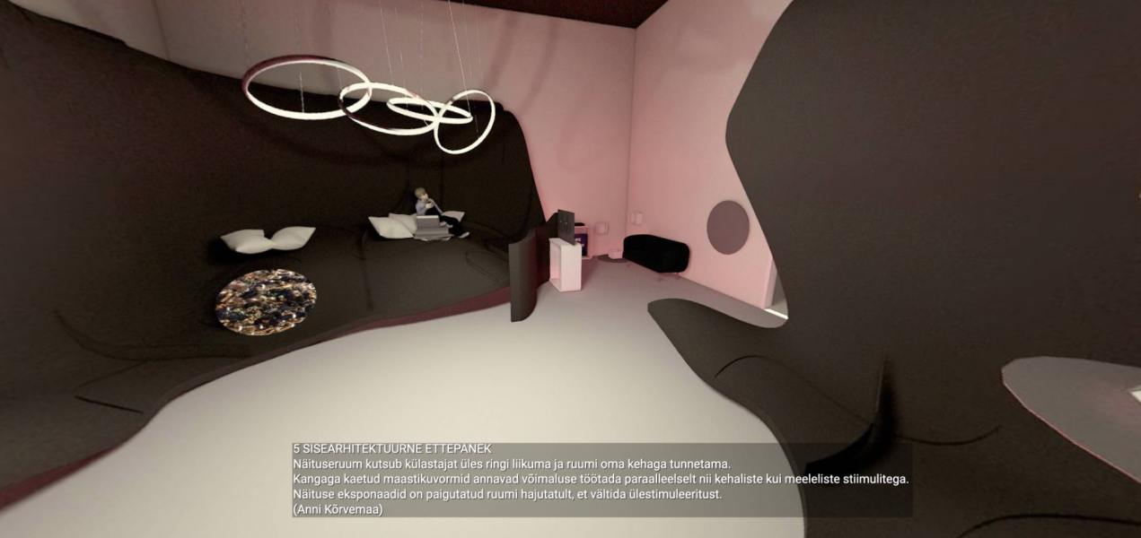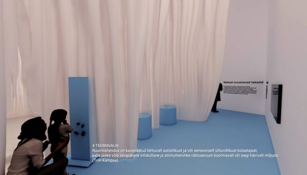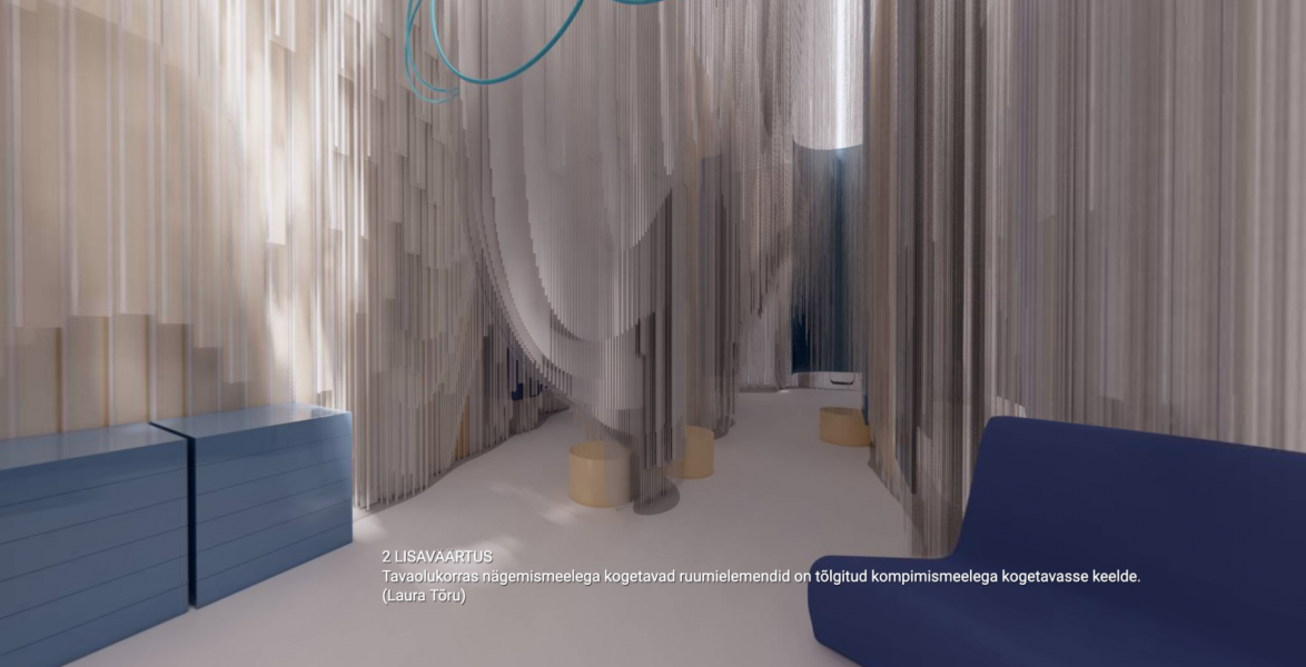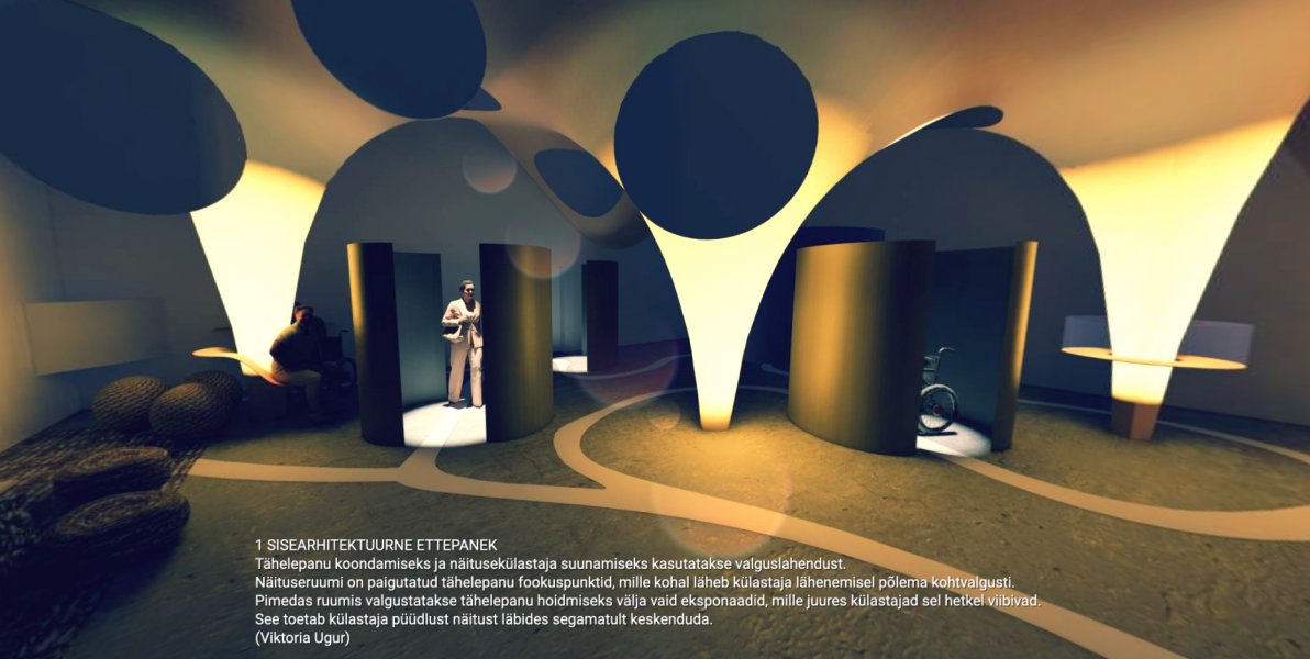 From early November, a selection of student works completed during the course (Laura Maria Tõru, Kätlin Lond, Triin Kampus, Anni Kõrvemaa, Viktoria Ugur) is available for everyone to see at the exhibition “Inclusive LIFE” at the Estonian National Museum in Tartu. The student work is presented on a touch screen as a virtual tour, which guides the visitors of the exhibition through more exciting space solutions and shares information on the application of the principles of inclusive design in interior architecture.