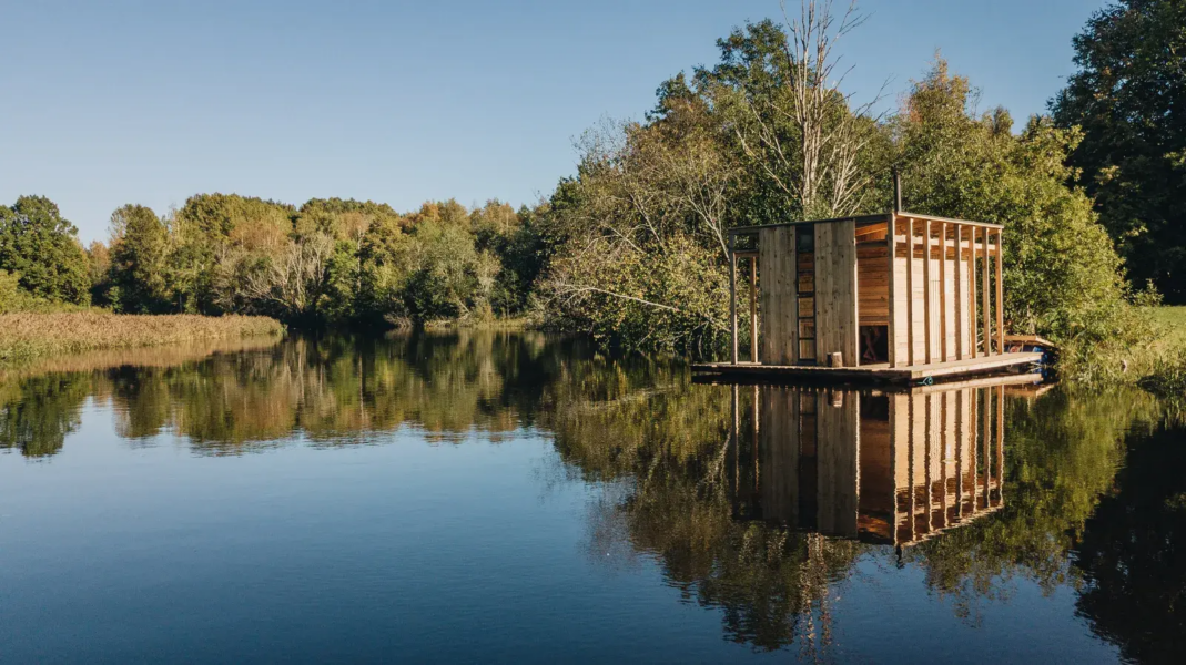 From 1 to 10 August 2017, an international summer school, mainly for architecture and design students, took place in Soomaa, during which students from 13 countries conceived and built the floating sauna Vala. The floating sauna is designed as a stopover and resting place for local residents and hikers in nature. The sauna from the artificial island is located in Soomaa, near a campfire site, next to which the Tõramaa River flows into the Raudna River. After the opening, the floating sauna awaits visitors and testers, now under the care of RMK as part of the hiking trail network, similar to the forest chimneys completed two years ago and the floating water slide Veetee completed during the 2016 summer school.