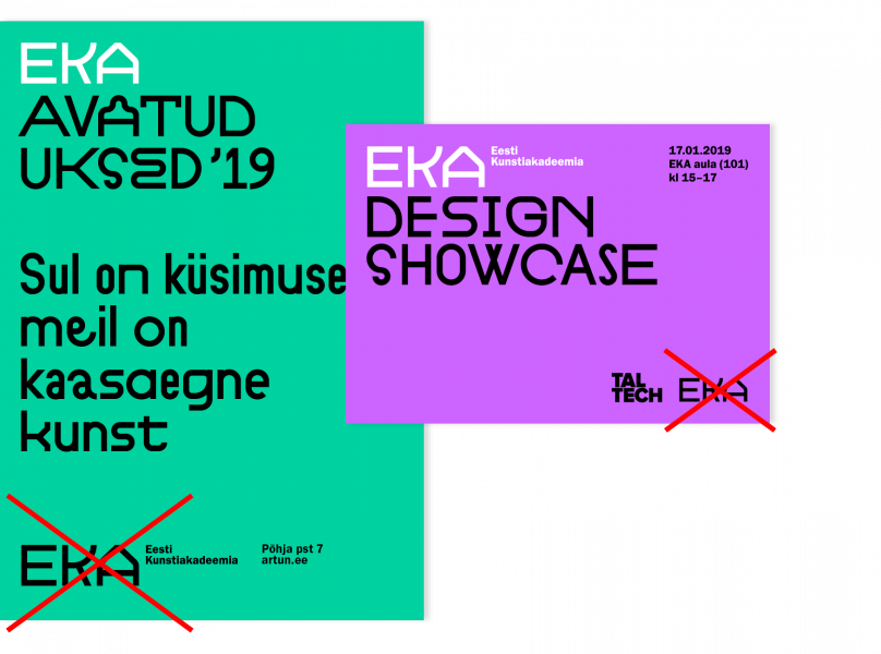 Kujundustes, mis ei kasuta EKA visuaalset identiteeti (näiteks koostööprojektid, tudengite loovprojektid vm), tohib EKA logo kasutada kas musta või valgena.