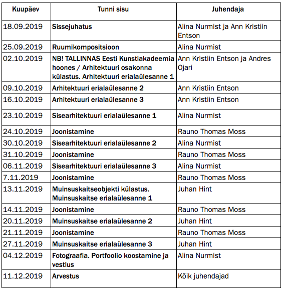Kursus on mõeldud eelkõige neile, kes kaaluvad astuda Eesti Kunstiakadeemia arhitektuuri ja linnaplaneerimise või sisearhitektuuri bakalaureuseõppesse. Kursusel käsitletakse valdkonna olulisimaid teemasid ja oskusi. Osalejal on võimalus mõista, milline on Eesti Kunstiakadeemias nende erialade õpe.