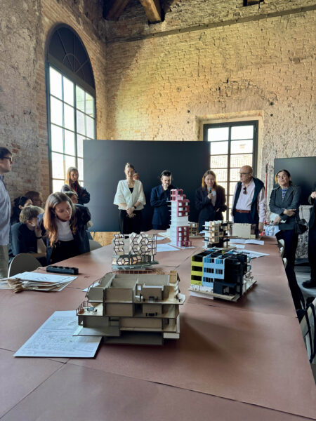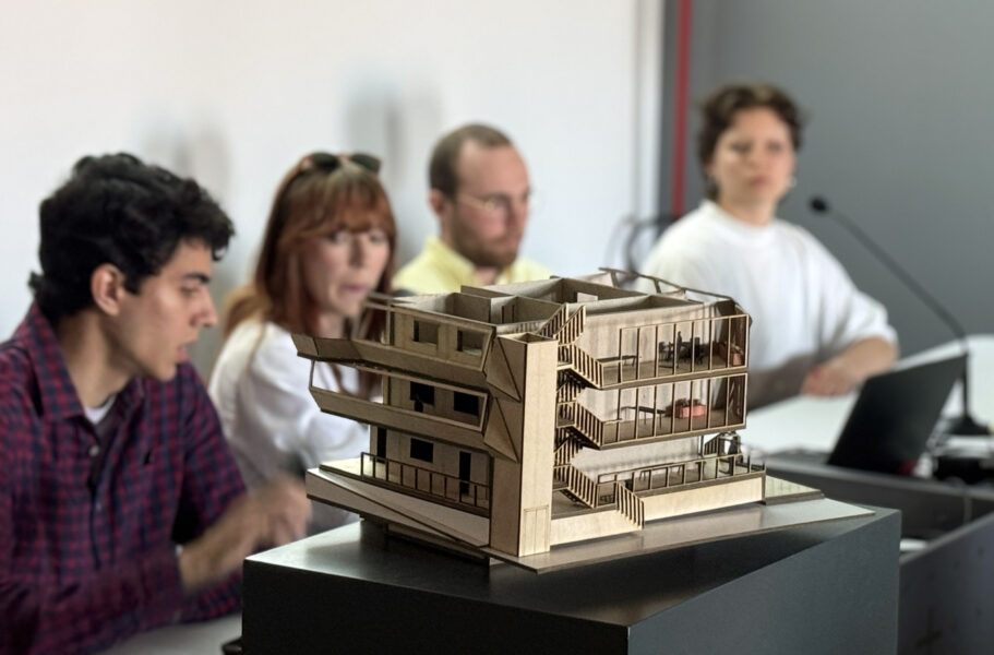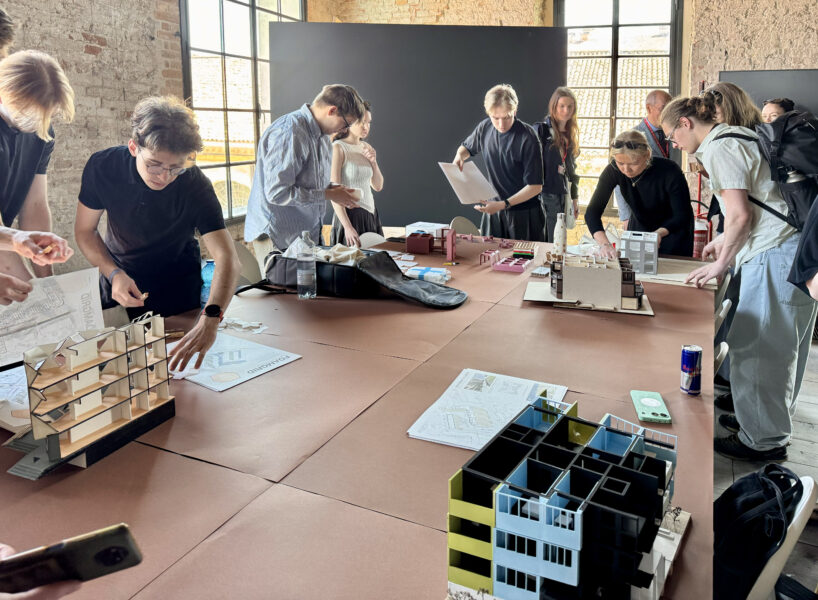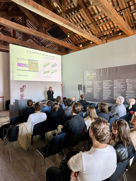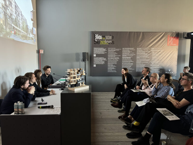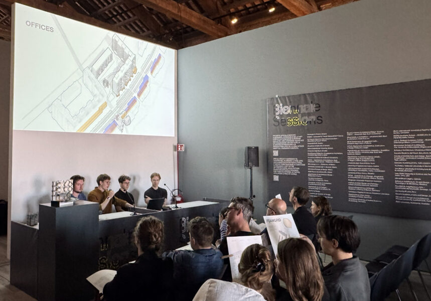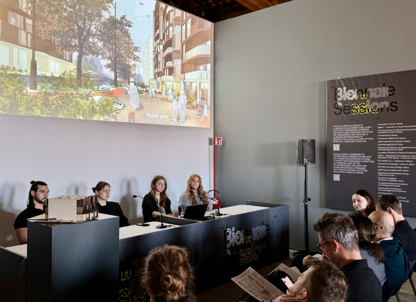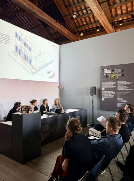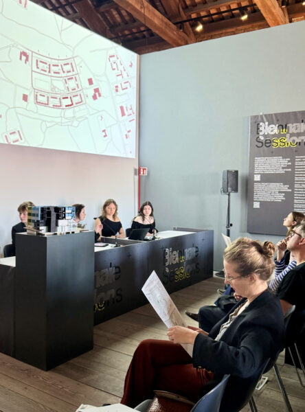 Hindamiskomisjon 3. kursusele tagasisidet andmas, Biennale Architettura 2025, Biennale Sessions 10.05.2025. Foto: Tiina Tammet
