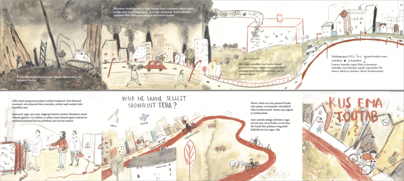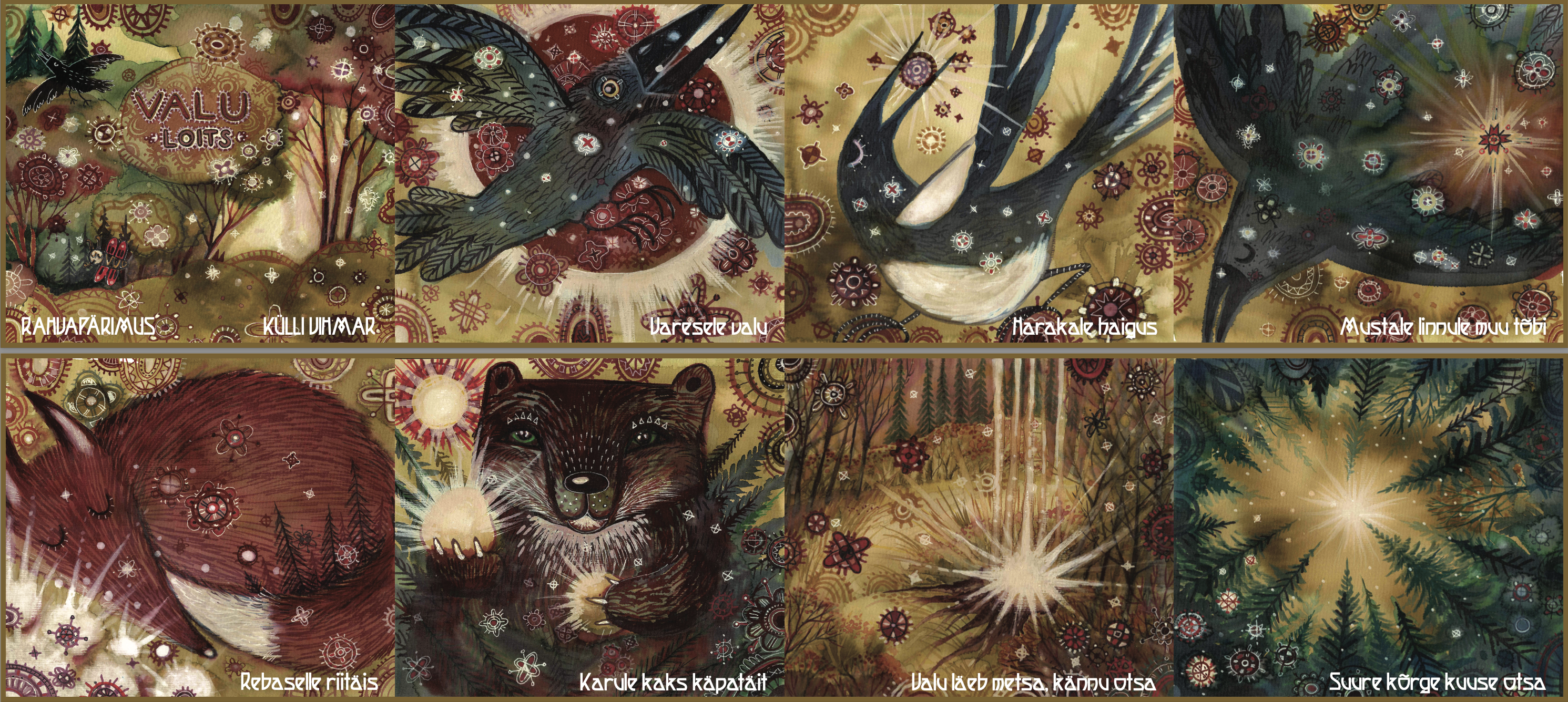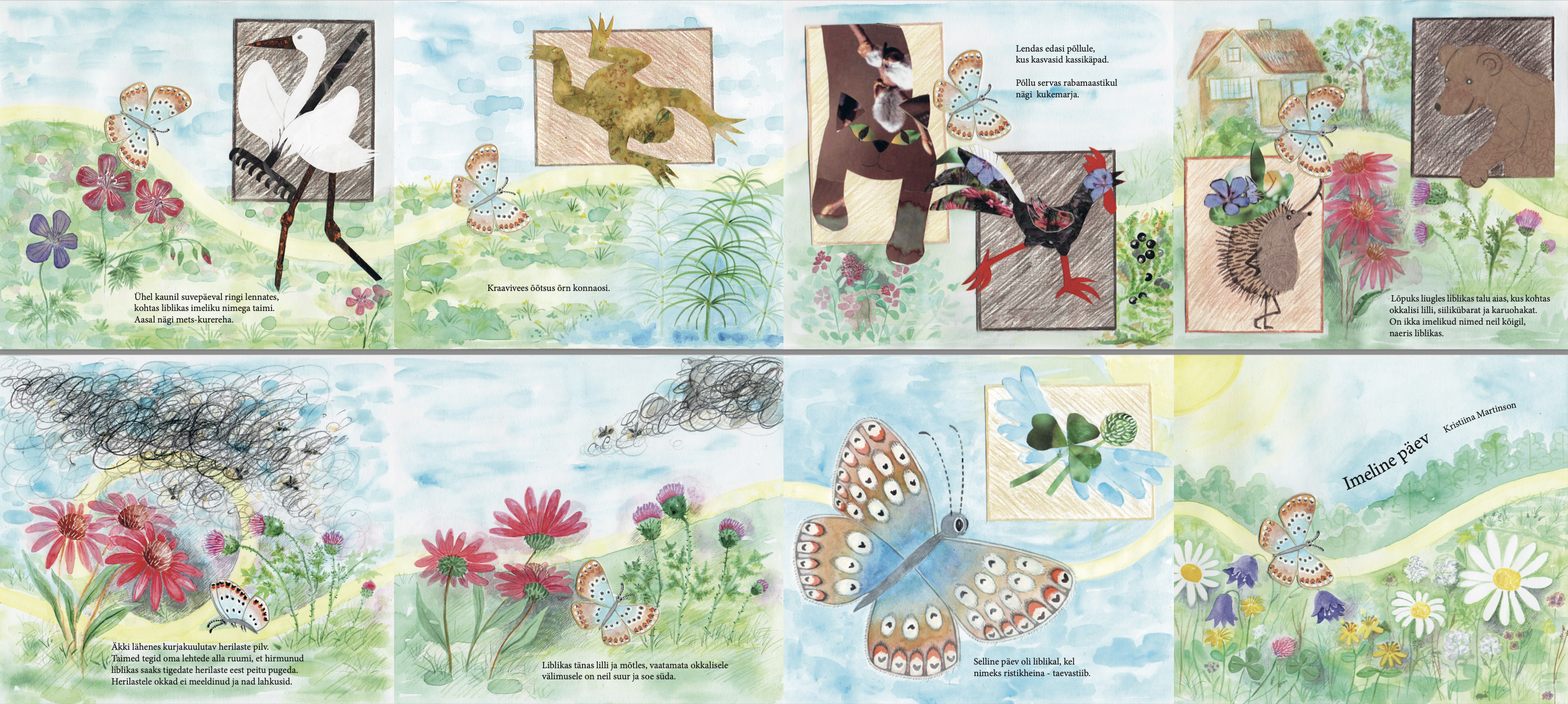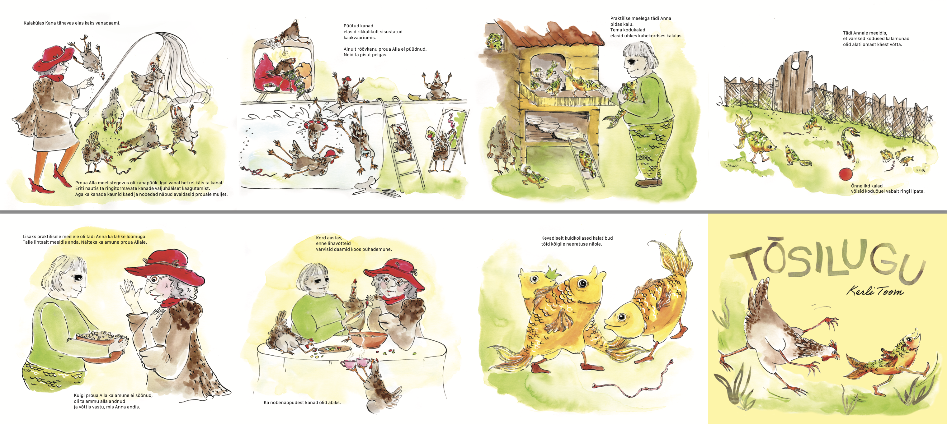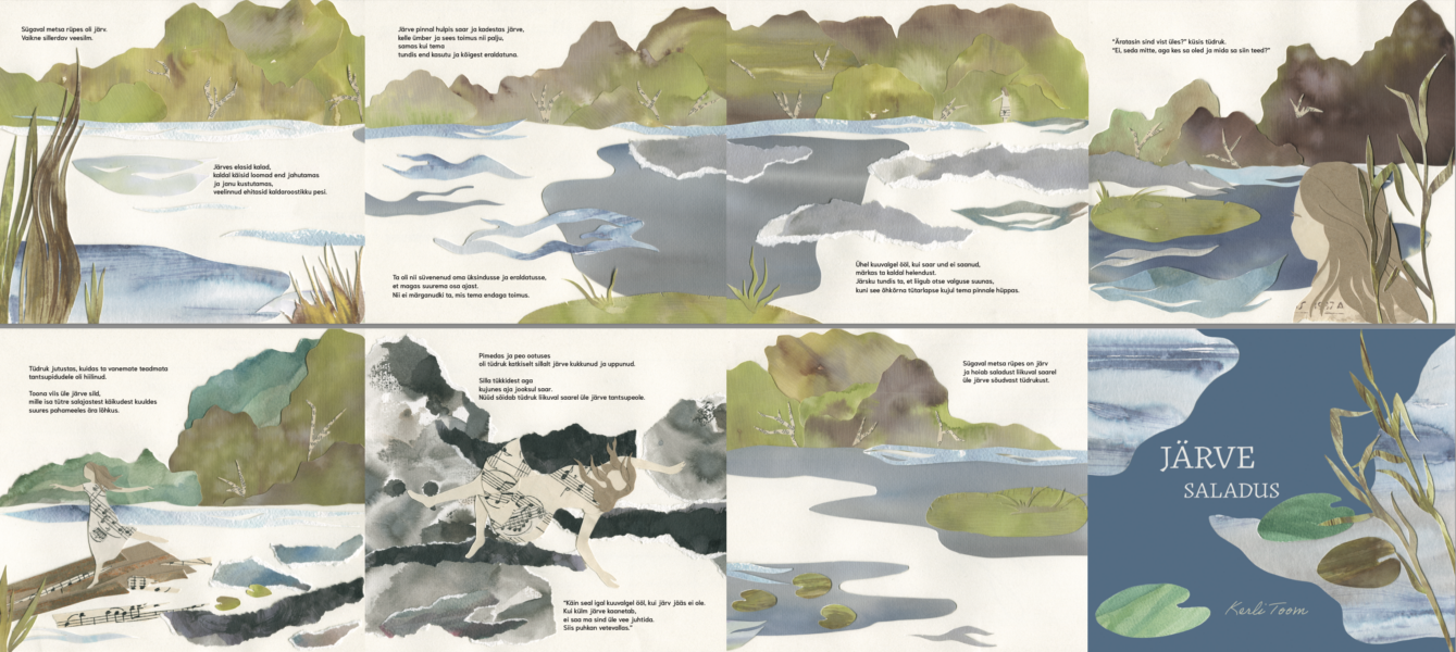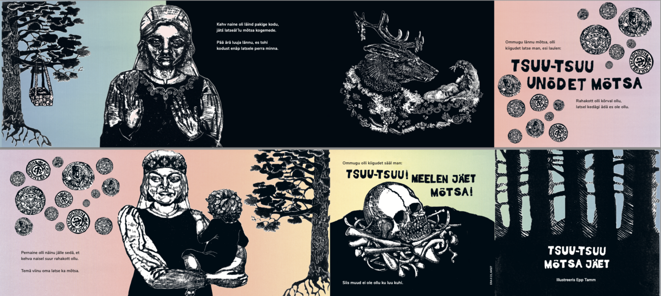 Linoollõike tehnikat kasutas traagilise pärimusloo illustreerimisel Epp Tamm – tulemus on jõuline ja mõjuv. Brit-Karen Petersoni leporello ühendab akvarellmaali ja tundliku joonistuse isikupäraseks autoritehnikaks.