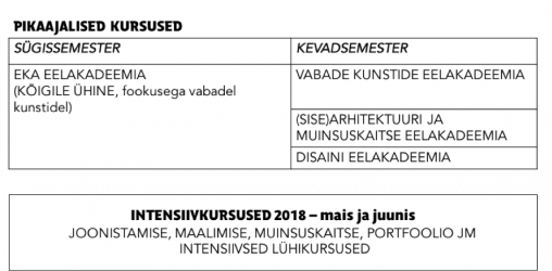 Äsja on lõppenud kolm eelakadeemia põhikursust (vaata skeemi): vabade kunstide, disaini ning (sise)arhitektuuri ja muinsuskaitse eelakadeemia ning mais ja juunis toimuvad veel lühemad intensiivkursused.