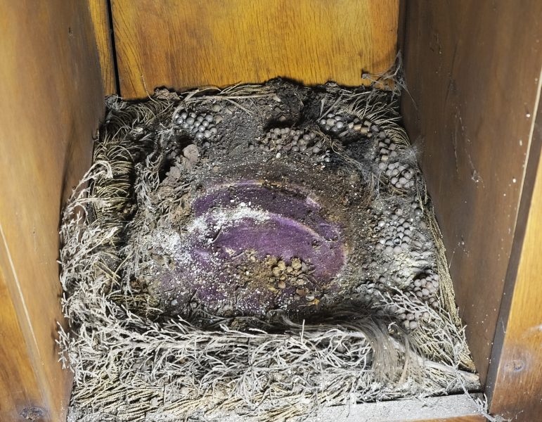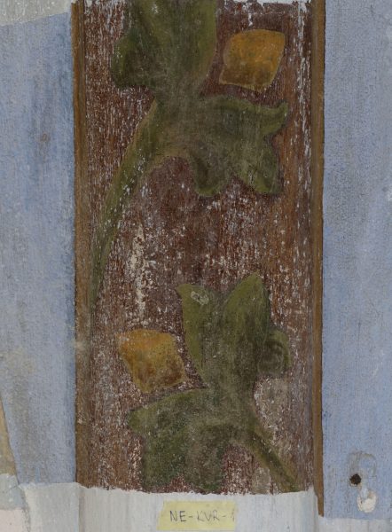 Aga ka sellega Kuusalu kooriruumi leiud veel ei piirdu. Mõne kuu eest tuli altarilaua seest välja üks puidust nikerdatud puu – kena detailike, mille algset asukohta samuti tuvastada üritati. Usutavasti pärineb see vappepitaafilt ja viitab, et vapp kuulus Nötebomide (= pähklipuu) suguseltsile. Peale puukese tolmust puhastamist võib sellel näha kenasid rohelise lüstervärvi fragmente.