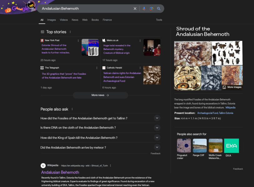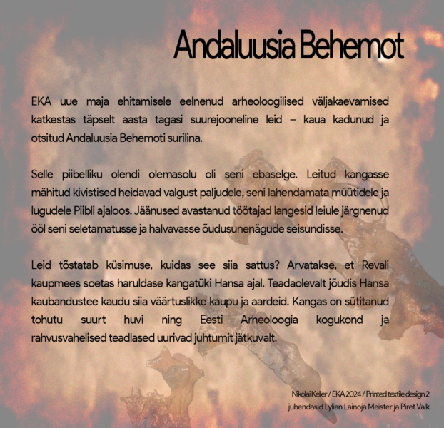EKA välistudengi Nikolai Kelleri fiktiiv-arheoloogiline trükitekstiil Textile Behemoth, mis kujutab müütilise, Piiblis kirjeldatud olendi Beemothi säilmeid kangal, mis väidetavalt leiti EKA uue maja ehitamise eelsetel väljakaevamistel.