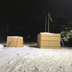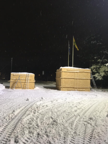Ühiselt kuhjati ja tambiti kahte suurde vormi ligi 100 tonni lund, mis küll sulailmaga mõnevõrra väiksemaks muutus, kuid külmade naastes hakkasid EKA tudengid Kail Timusk, YiYang Sun, KitKit Para, Mia Mai Seppel, Jessica Titze, Hans Henrik Guthan, Rainer Tilk, Marten Prei, Kristi Laanemäe, Ellen Laaksonen ja Erik Leedjärv massiivsetest lumekuubikutest kujusid tahuma ja peagi vaatavad staadionil tõtt konnapere ja kärbes.
