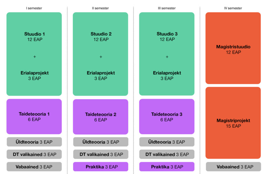 Kaheaastane täiskohaga õpe toimub nii eesti kui inglise keeles, hõlmates seminare, loenguid, töötubasid, kaastudengite edasi-sidestamist ja omaalgatuslike projektide läbi viimist. Stuudiumid on loodud autonoomsete taidepraktikate edendamiseks, mida toetab individuaalne juhendamine ja lai valik tehnilisi oskusi, mida on võimalik omandada vastavalt tudengi personaalsele õpinguplaanile.