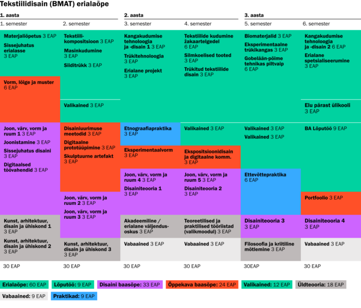 Esimene osa erialasest bakalaureuseõppest annab materjalide ja tehnoloogiate tundmise. Programmi teine osa keskendub kaasaegseid disainitrende arvestavatele rõiva- ja sisustustekstiilidele. Kolmas osa õppekavast sisaldab spetsiaalselt kohandatud projekte, mis keskenduvad sisulistele disainiprobleemidele. Tudengid õpivad rakendama juba omandatud teadmisi ja tehnilisi oskusi. Töötatakse välja originaalsed lahendused, mis väljendavad individuaalseid ideid ning täidavad samal ajal projektis püstitatud eesmärke. Portfoolio võimaldab oma oskusi mõtestada, end tutvustada ning positsioneerida disainimaastikul. Bakalaureusetööga toimub erialane spetsialiseerumine.