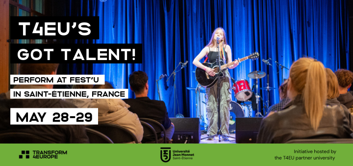 Avatud on kandideerimine rahvusvahelisele Fest’U 2026 tudengite kunstifestivalile, mis toimub 28.–29. mail 2026 Saint-Étienne’is, Prantsusmaal. Festivali korraldab Université Jean Monnet ning osalema on oodatud tudengid kõigist T4EU partnerülikoolidest. Valituks osutunud esinejate reisija majutuskulud kaetakse.