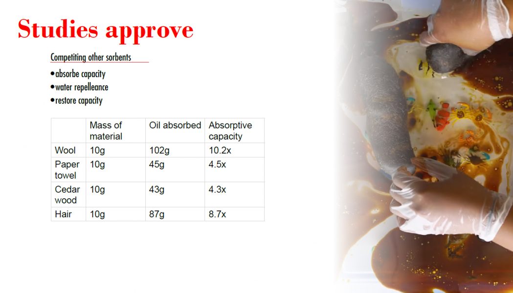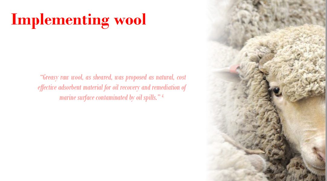 Among other natural and even most synthetic materials, studies approve that wool is the best in oil absorbing, water repealing and it also has a nice restore capacity after the oil has been removed from its surface. However, yet it is not used in oil response technologies. Our research has pointed out that implementing wool in oil response technologies has justification, but at least worth a try. Our solution is a product based service. We considered to create such a system that fits the existing instruments, so that it doesn’t require huge money investments.