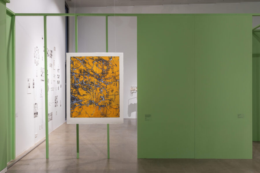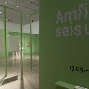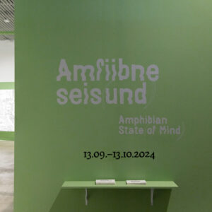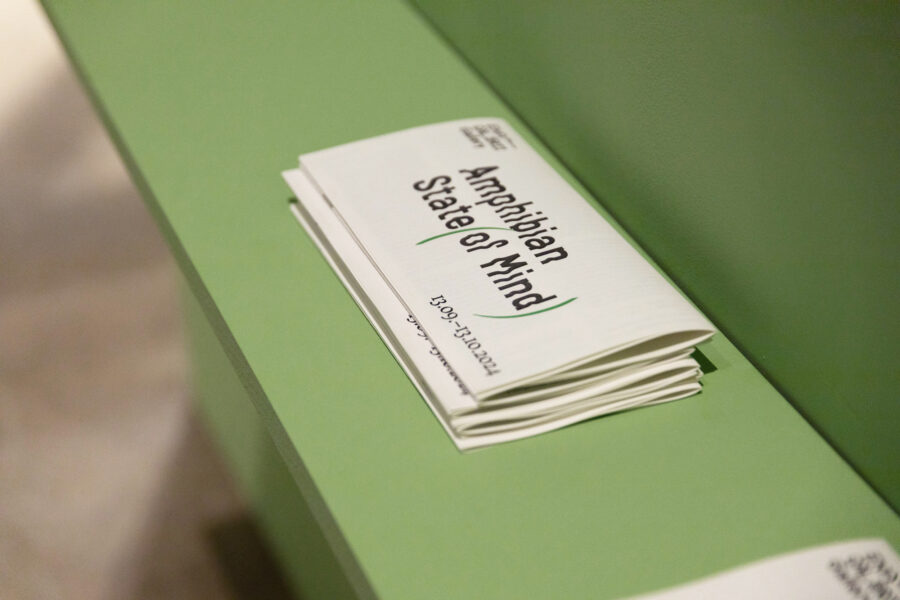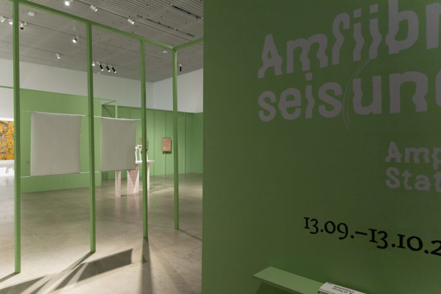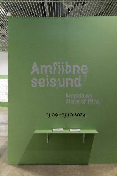 Rahvusvaheline näitus „Amfiibne seis(und)“ uurib kunstiteoste ja nende loodud diskursuste vahelisi seoseid. Idee püstitus lähtub Per Nilssoni filosoofilisest esseest „Amphibian Stand“. Näitus uurib kehade, looduse ja animismi vahelisi suhteid ning vaatleb kunstipraktikaid, mille puhul rakendatakse materiaalsele objektile (näiteks koormarihm, vaskplaat, kangatükk, savi jms) kunstniku arusaama selle materjali kohta, et muuta objekti tavapärast diskursust ja saada uusi teadmisi. Näitusel esindatud töömeetodid – graafika, joonistus, tekstiil, keraamika jne – põhinevad puudutusel ja haptilisusel ning võimele lugeda pinnatekstuure. Oma loomingus aktiveerivad kunstnikud materjalide väge žestide ja hoolitsuse kaudu.