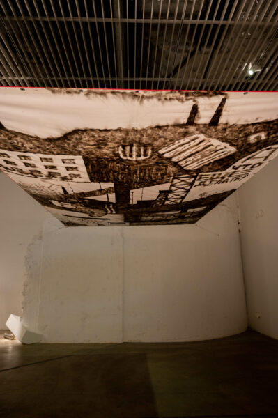 KOOPAKUMMITUSED, installatsioon sisaldab suitsuga maalimise tehnikat ja katab sissepääsu galeriisse kinni, taasluues kogemuse, mille annab tunneli kaevamine või trepist alla minek ja sisenemine keldrisse.