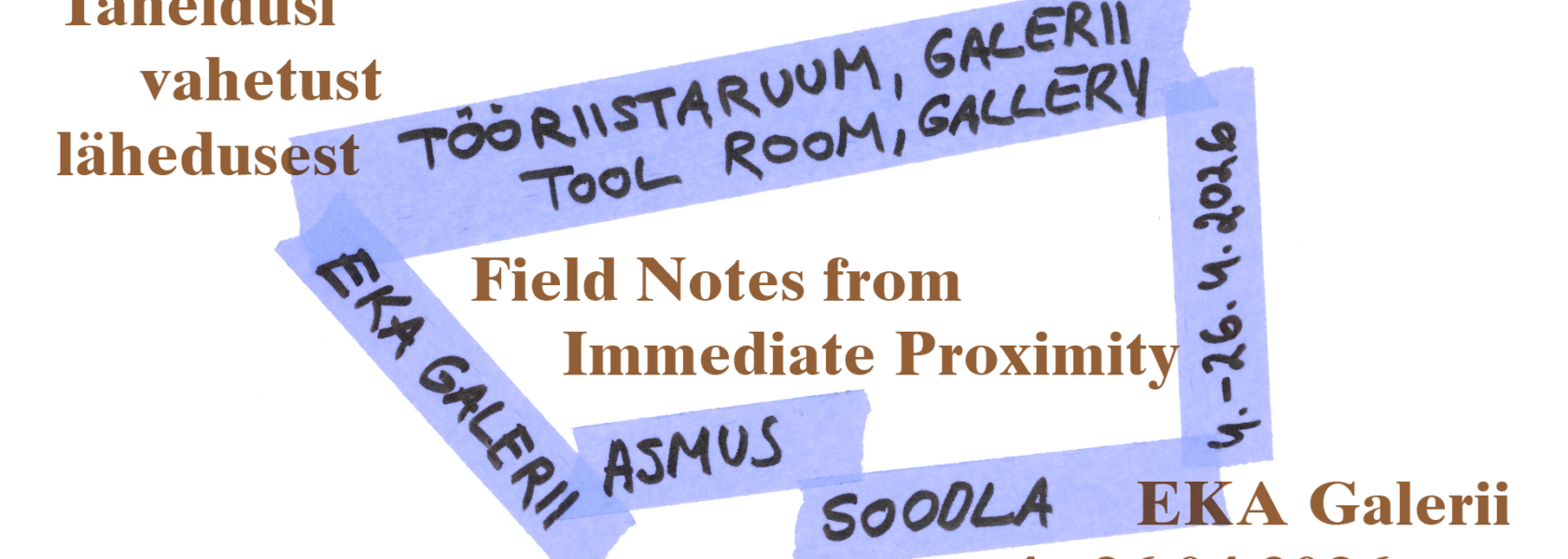 Asmus Soodla „Tööriistaruum, galerii” EKA Galeriis 4.–26.04.2026 Avatud T–L 12–18 P 12–16, sissepääs tasuta (NB! Suurel reedel, 3.04. ja (NB! Suurel reedel, 3.04. ja Ülestõusmispühade 1. pühal, 5.04. on EKA Galerii suletud!) Avamine: N 2.04. kell 18 Ringkäigud: R 10.04 kell 13.00 (eesti keeles) / P 12.04 kell 14.30 (eesti keeles) / P 12.04 kell … Jätka Asmus Soodla „Tööriistaruum, galerii” EKA Galeriis 4.–26.04.2026 lugemist