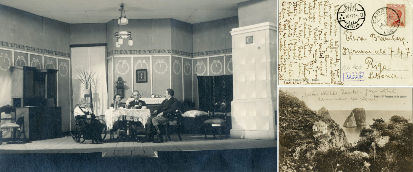 A scene of the play "Women of Niskamäki" by Hella Wuolijoki. The collection of Valga Museum. VaM F 1659:28. Postcard. A. Lācis to E. Bramberga from Capri, 6th of June 1924, where A. Lācis got acquainted with Walter Benjamin. 8.8 x 13.8 cm, courtesy Museum of Literature, Theatre and Music, Riga