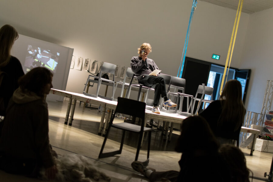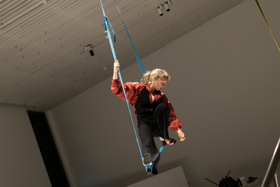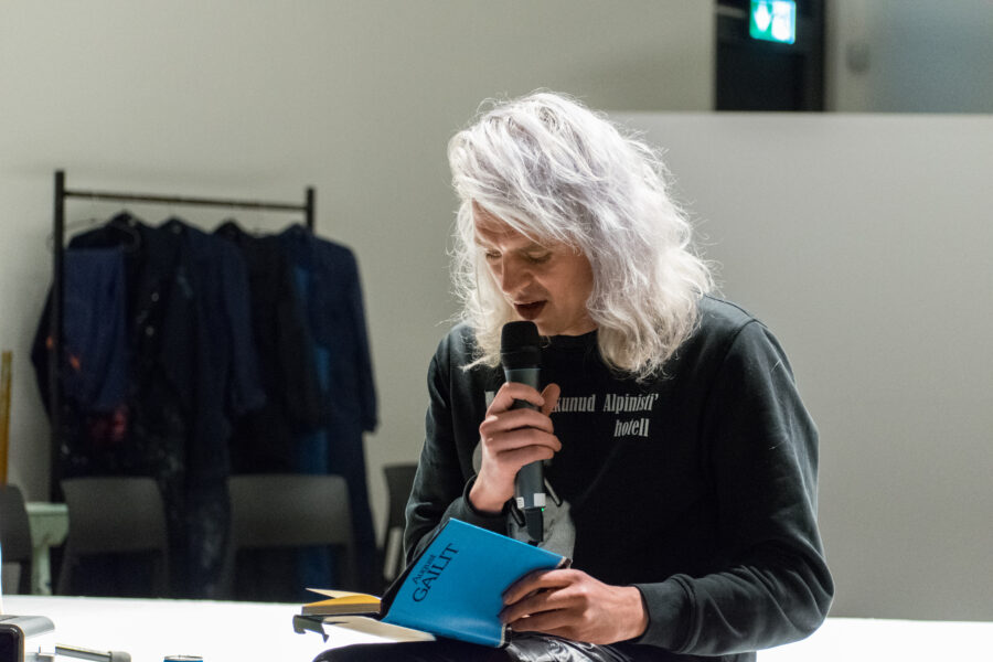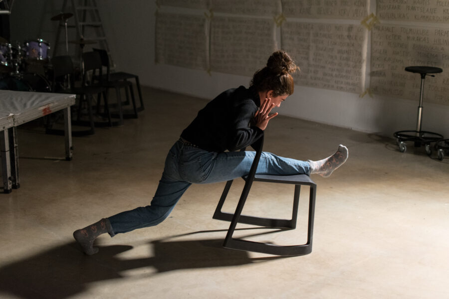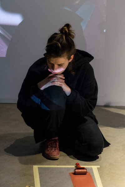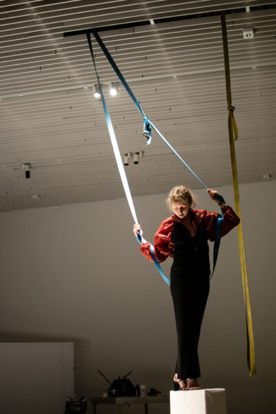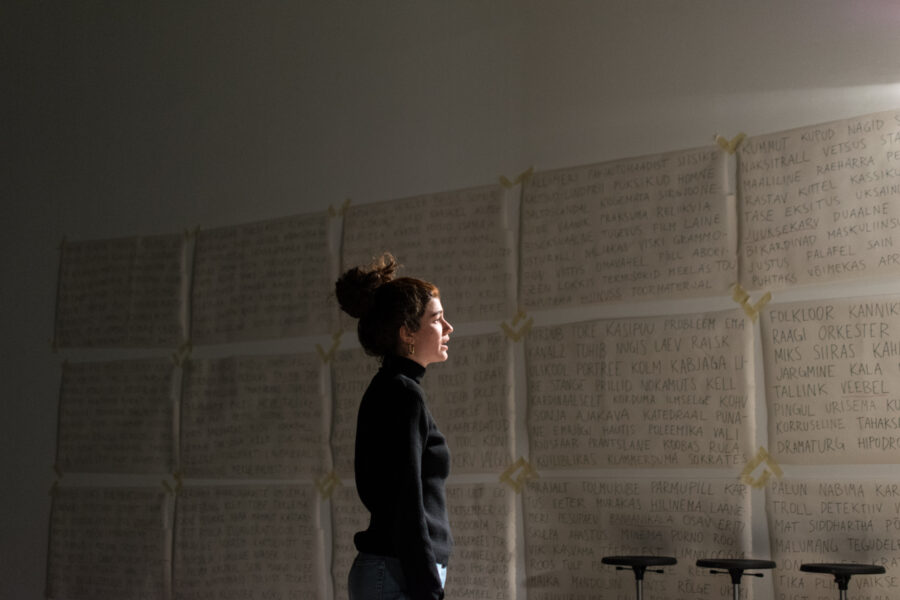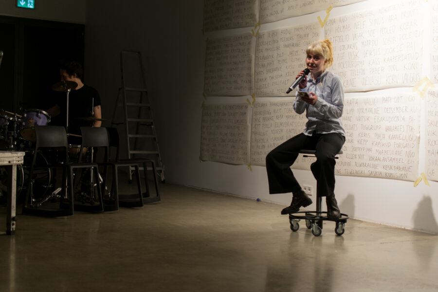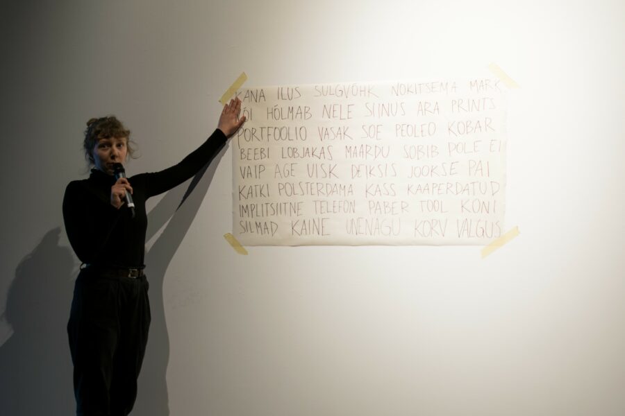 Suuline performance, kus Saara Liis Jõerand abstraktseid sõnu näitusele sobivaks konkretiseerib