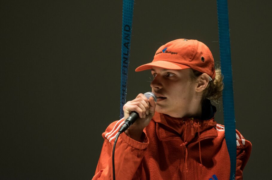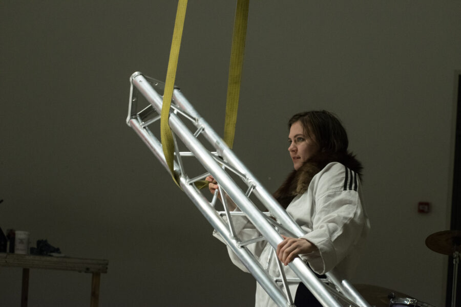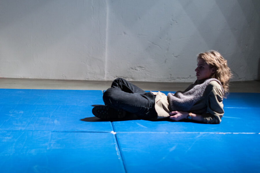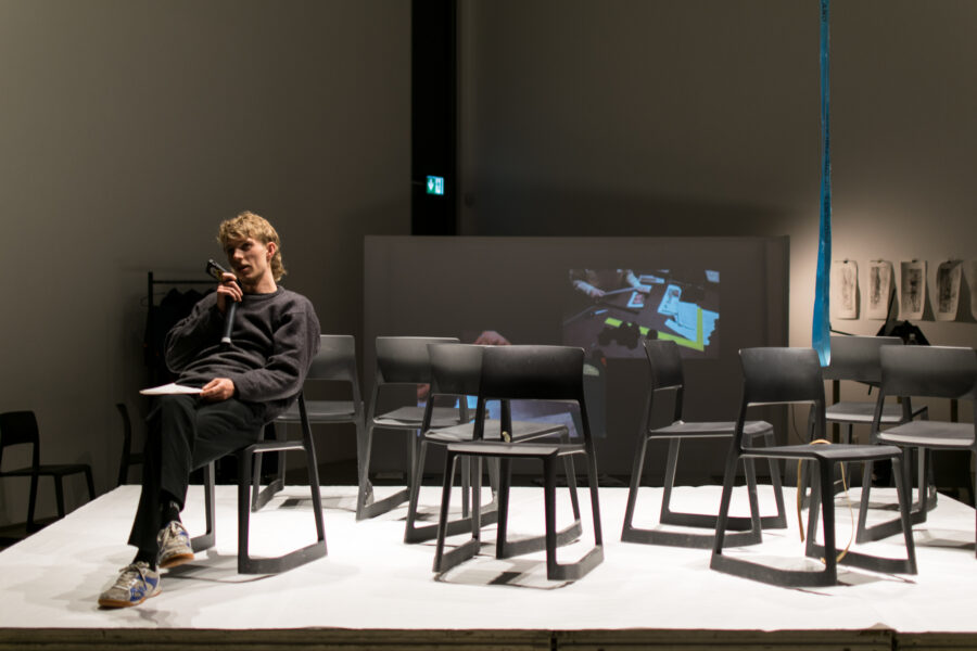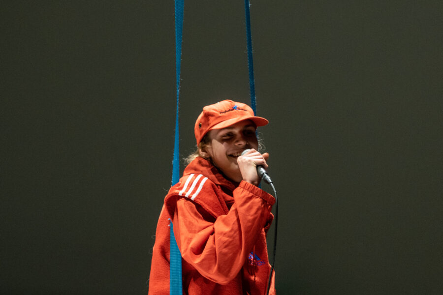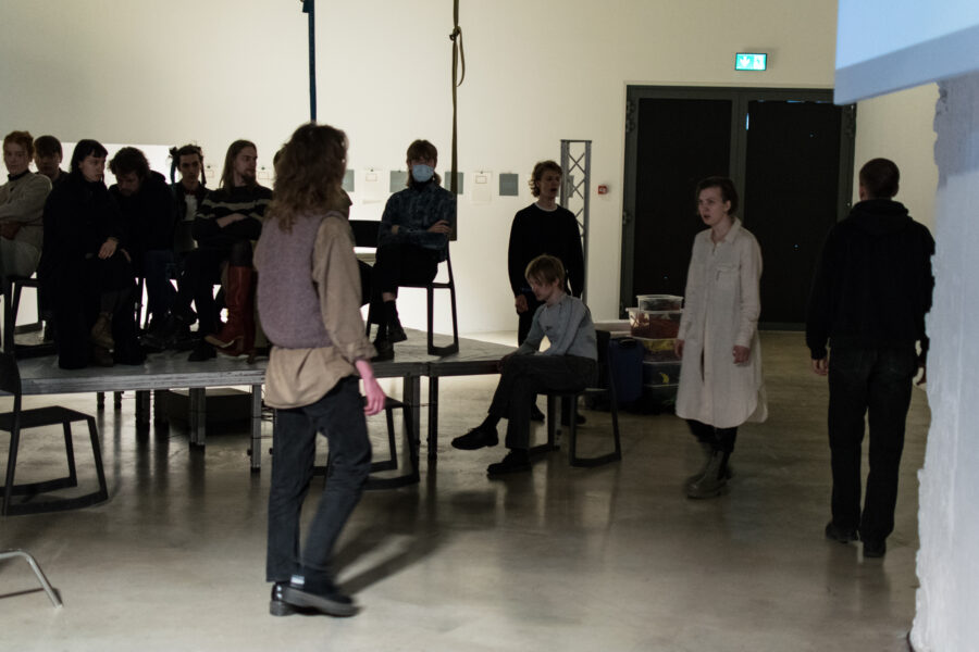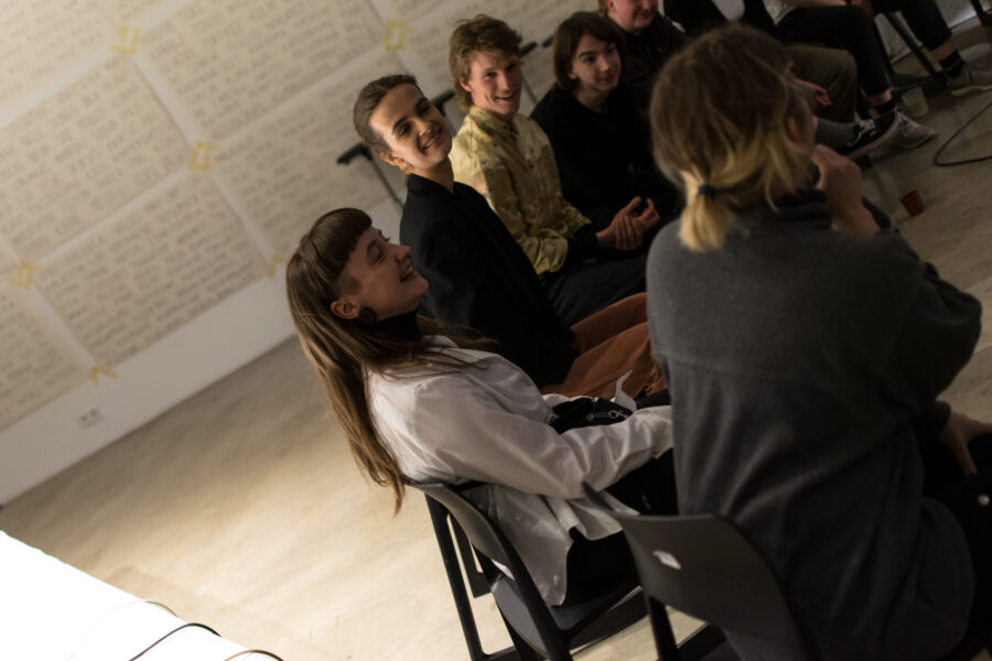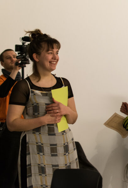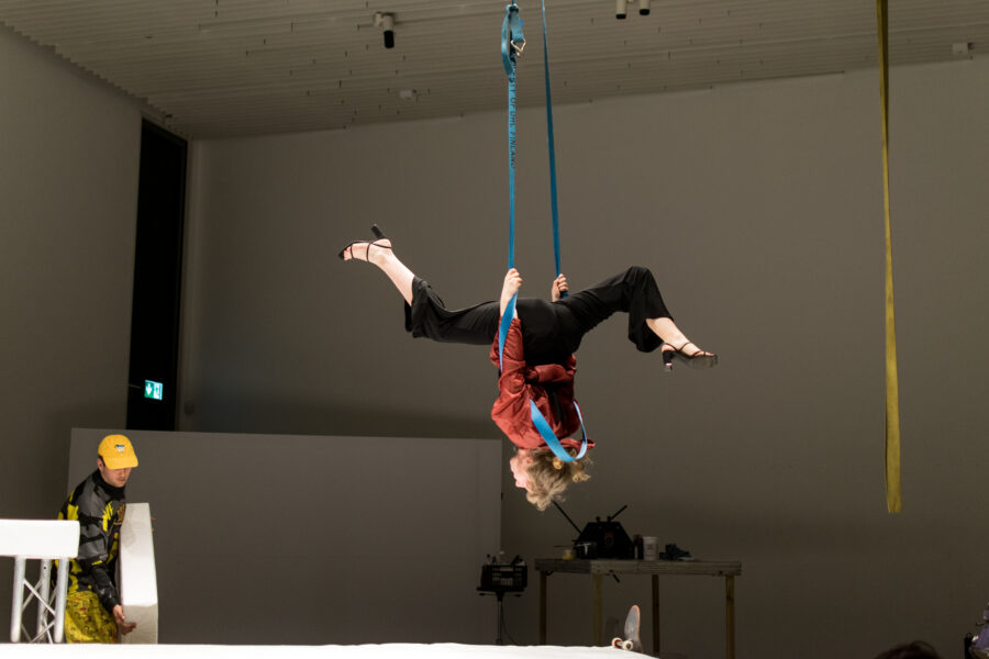Suuline performance, kus Saara Liis Jõerand abstraktseid sõnu näitusele sobivaks konkretiseerib