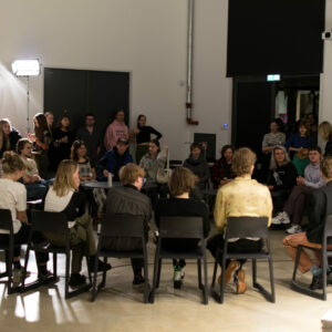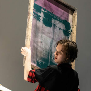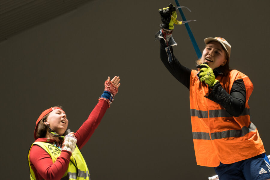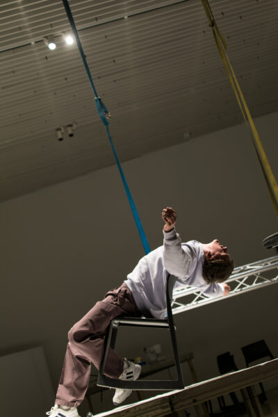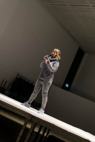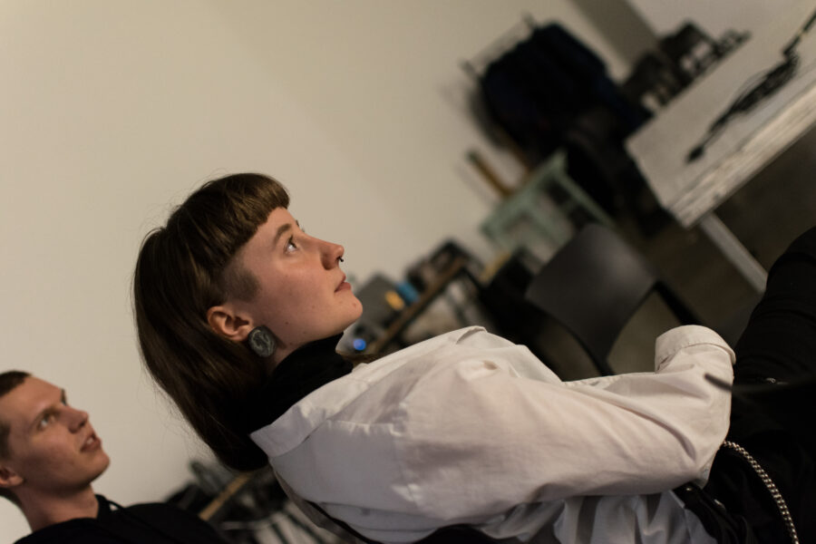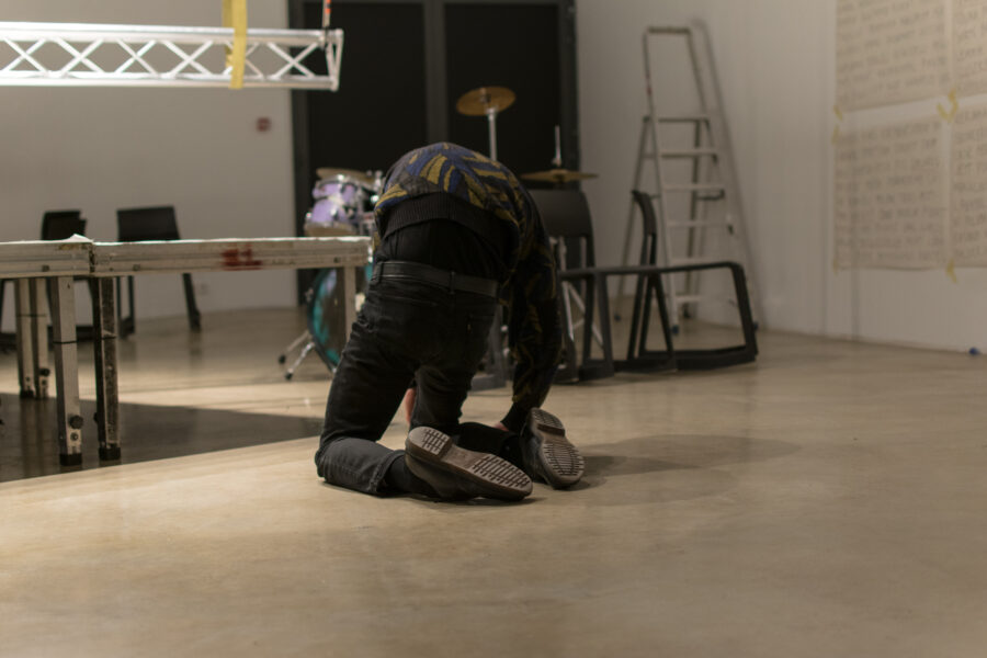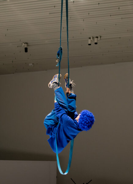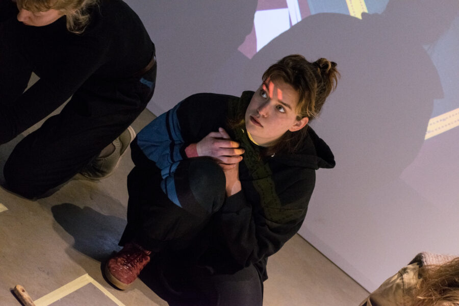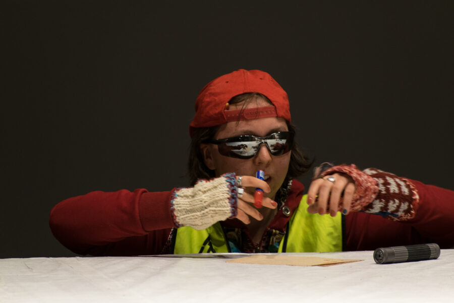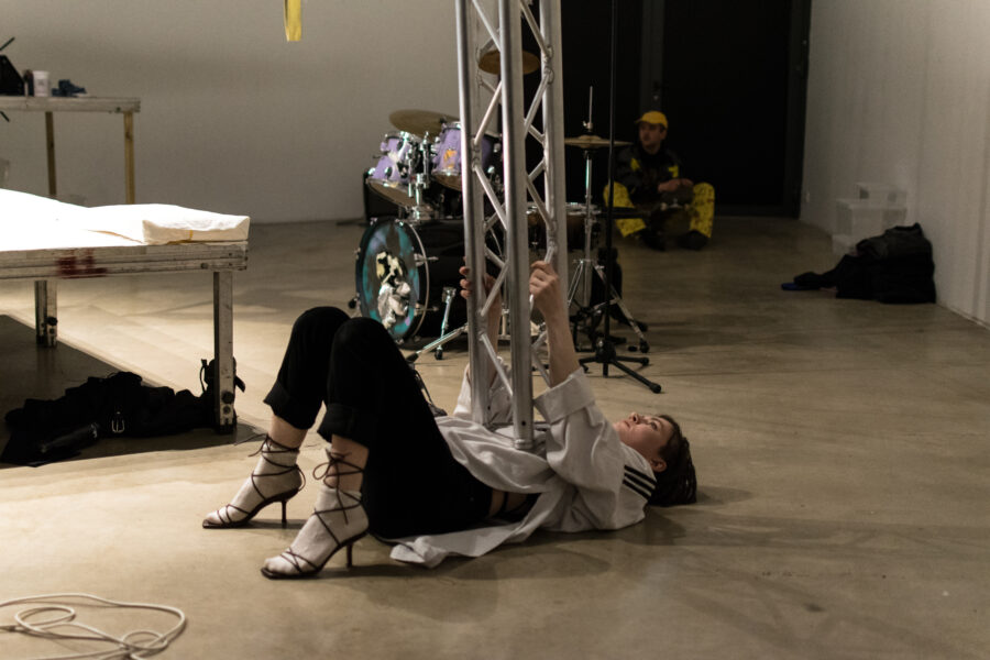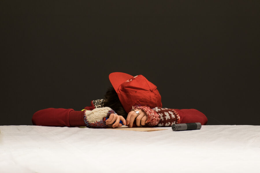 Suuline performance, kus Saara Liis Jõerand abstraktseid sõnu näitusele sobivaks konkretiseerib