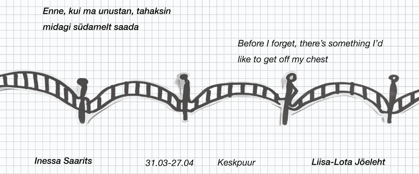 30. märtsil kell 13.00 avatakse Keskpuuris EKA skulptuuritudengite Inessa Saaritsa ja Liisa-Lota Jõelehe ühisnäitus “Enne, kui ma unustan, tahaksin midagi südamelt saada”. Näitus jääb avatuks 31.03-27.04 iga päev kell 8.00–15.30.