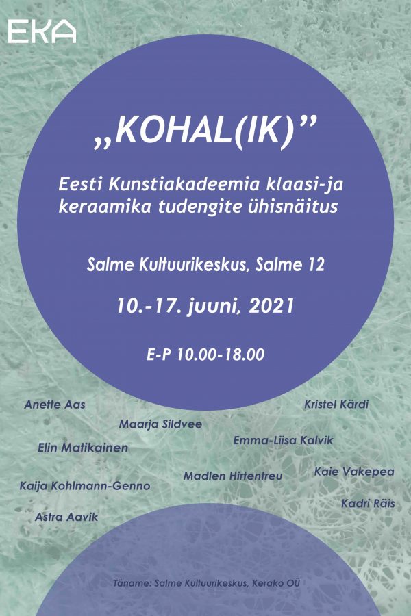 EKA 2. kursuse keraamika ja klaasikunsti tudengite ühisnäitus „Kohal(ik)“ Salme kultuurikeskuses on osa Tallinna rakenduskunsti triennaali „Kumab läbi“ satelliitprogrammist.