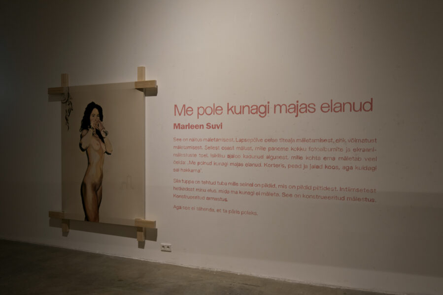 Kunstnik Marleen Suvi näitus „Me pole kunagi majas elanud“ koondab mastaapsesse installatsiooni 16 suureformaadilist lõuendit, mille fookuses on mälu ja ühe perekonna lugu.