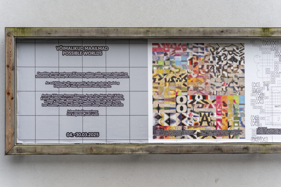 Graafilise disaini osakonna III kursuse näitus, mille raames tudengid on kasutanud väligaleriid, et tutvustada fragmente oma lõputööprojektidest.