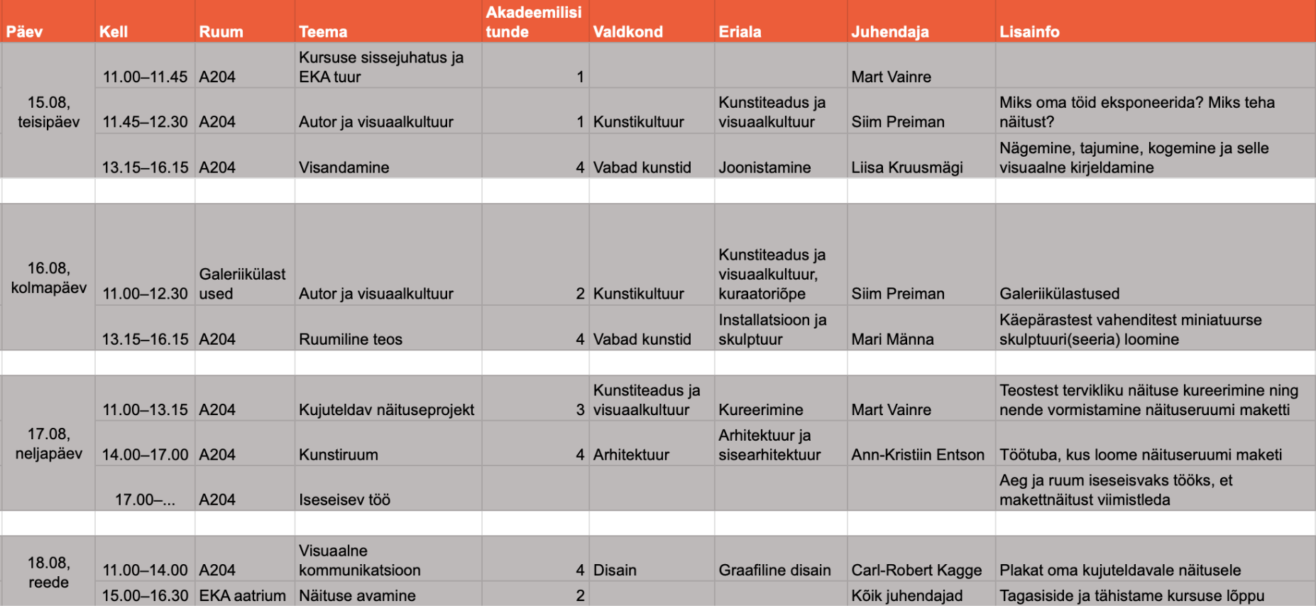 Aeg: 14., 17., 21. ja 24. august 2023 kell 16–19.45