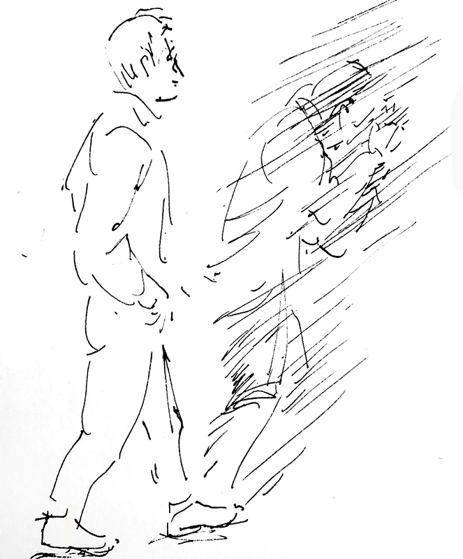 Oleme harjunud joonistama seisvaid inimesi otsevaates ja hea valgusega. Seekord vaatleme, kuidas inimene reageerib tuulele, pimedusele, palavusele, vihmale, lumele, udule ja külmale, joonistades poose, mis väljendavad neid aistinguid.