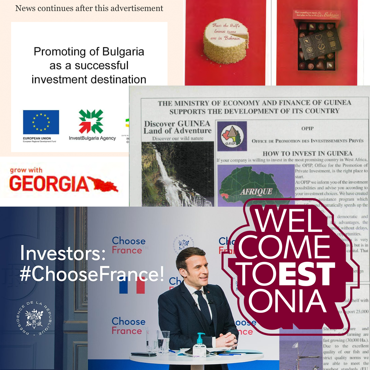 India on ärile avatud. Guinea on ärile avatud. Bulgaaria reklaamimine eduka investeeringute sihtkohana. Choose France. Welcome to Estonia. Sellised reklaamid vohavad Financial Timesi, The Economisti, Äripäeva ja teiste rahvusvaheliste ärilehtede reklaamiveergudel. Mida need reklaamid õigupoolest teevad? Ons tegu kõigest tähtsusetu lobaga või muudavad nad tegelikult ka midagi?