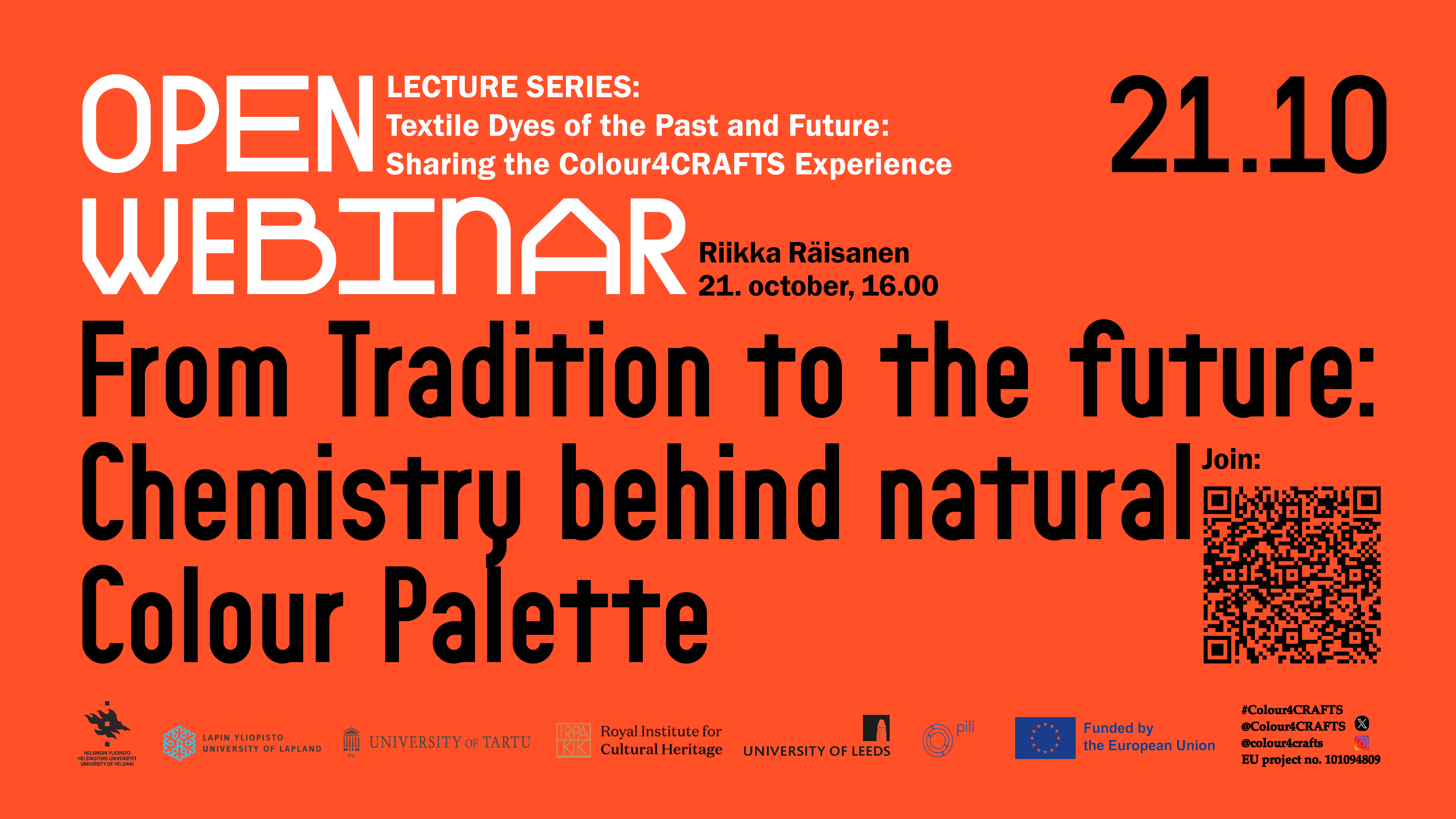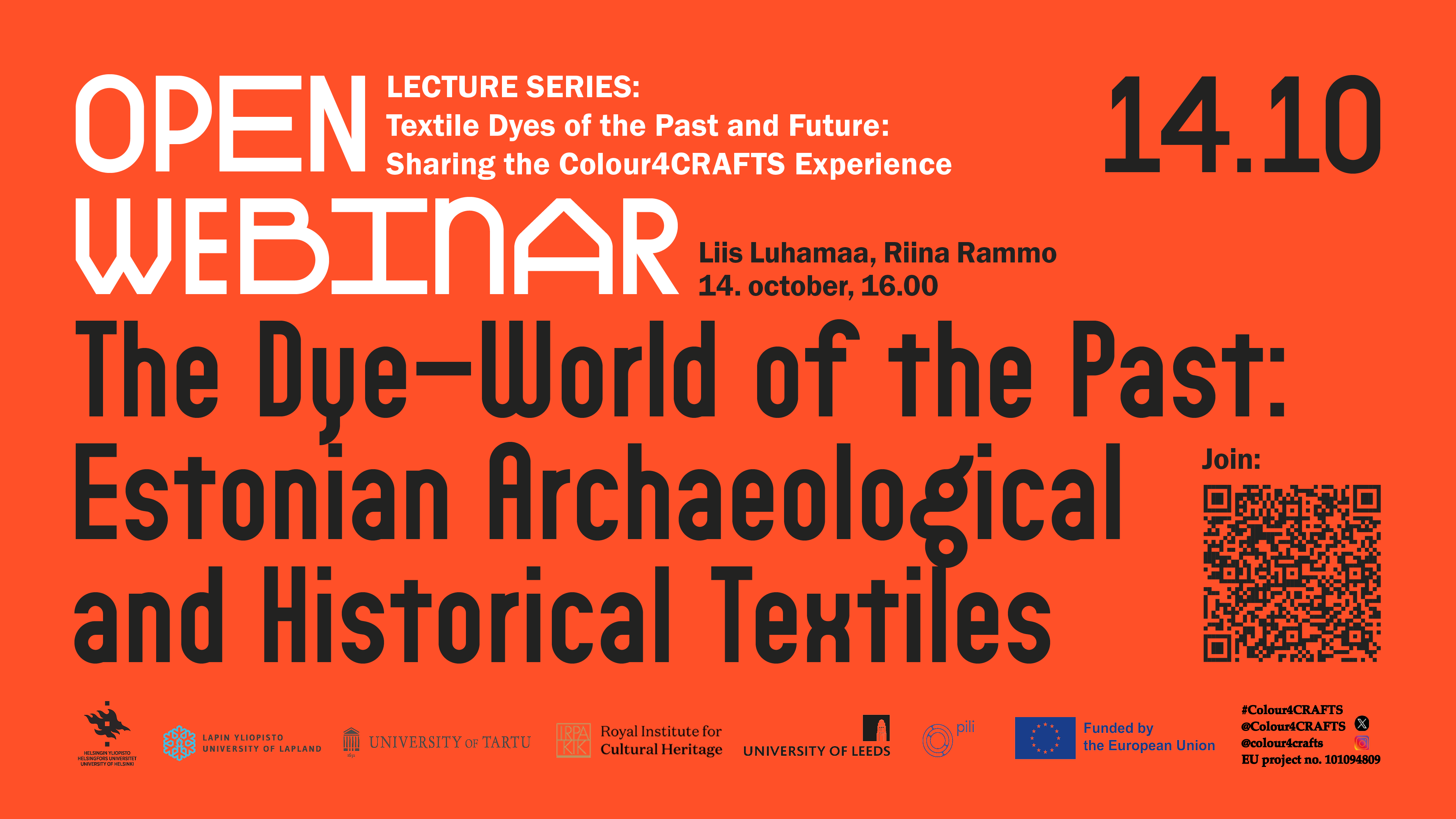 Loengusari toob kokku EU Horisondi projekti Colour4CRAFTS liikmed ja olulised külalised, et arutleda ja jagada oma teadmisi tekstiilivärvimisest minevikus ja tulevikus. Loengusarja on ellu kutsunud Tartu Ülikool ja Viljandi Kultuuriakadeemia koostöös Eesti Kunstiakadeemiaga.