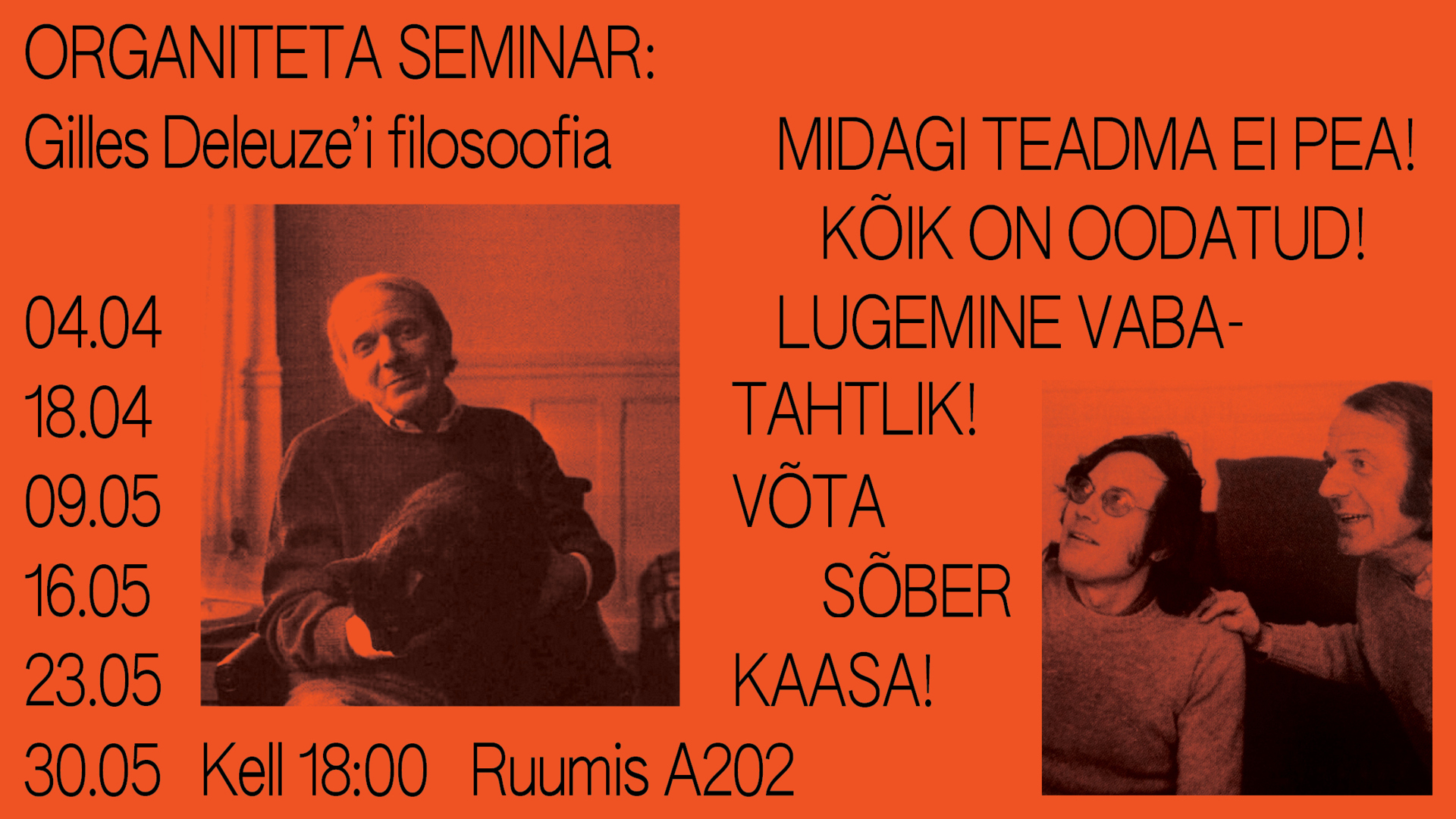 Seminar toimub kuuel kevadisel teisipäeval kell 18.00 ruumis A202 ning iga kord võetakse ühiselt luubi alla mõni teema või mõiste, mida Deleuze põhjalikumalt käsitlenud on.