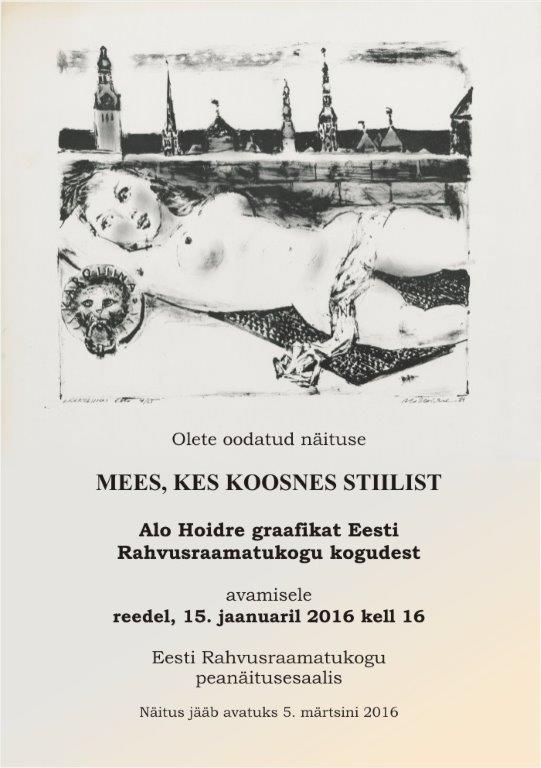 Eesti Kunstiakadeemia eelkäija, Eesti NSV Riikliku Kunstiinstituudi legendaarse graafika professori Alo Hoidre 100. sünniaastapäeva tähistamiseks avatakse täna, 15. jaanuaril kell 16 Eesti Rahvusraamatukogu peanäitusesaalis näitus „Mees, kes koosnes stiilist. Alo Hoidre 100“.