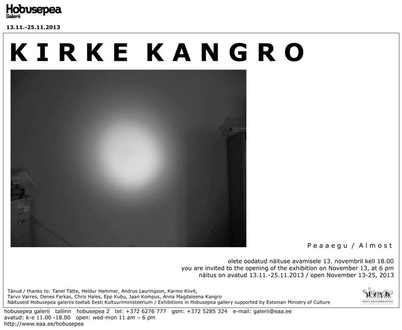 13.11.2013 kell 18.00 avab KIRKE KANGRO (1975) Hobusepea galeriis isiknäituse „Peaaegu“.