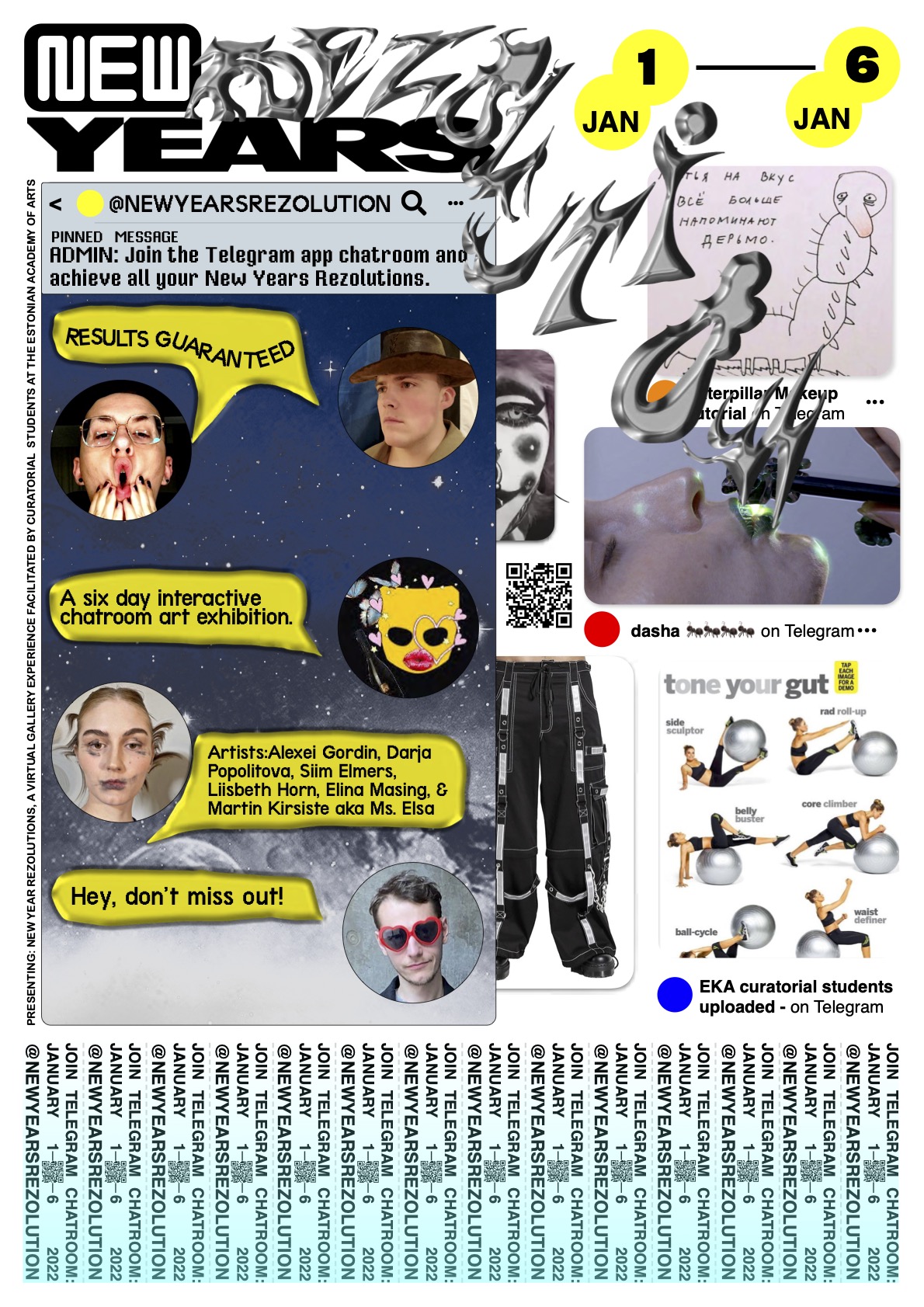Näituse „NewYearsRezolution” kõige suuremaks eripäraks ja proovikiviks on toimumine vestlusrakenduses „Telegram“. Miks? Sest vestlusel, mis toimub läbi sõnumite, piltide ja emojide on oma kindel tunnetus. Ekraanil ei koge me asju nii kuis päriselus ning just seda mõju soovitakse projektis avastada. Näituse õnnestumiseks pakub suurepärast pinnast just uue aasta algus, mil suurem osa ühiskonnast kipub erinevate substantside tarbimise tagajärjel olema võimeline vaid telefoniekraani vaatama. Miks mitte vaadata siis juba näitust?