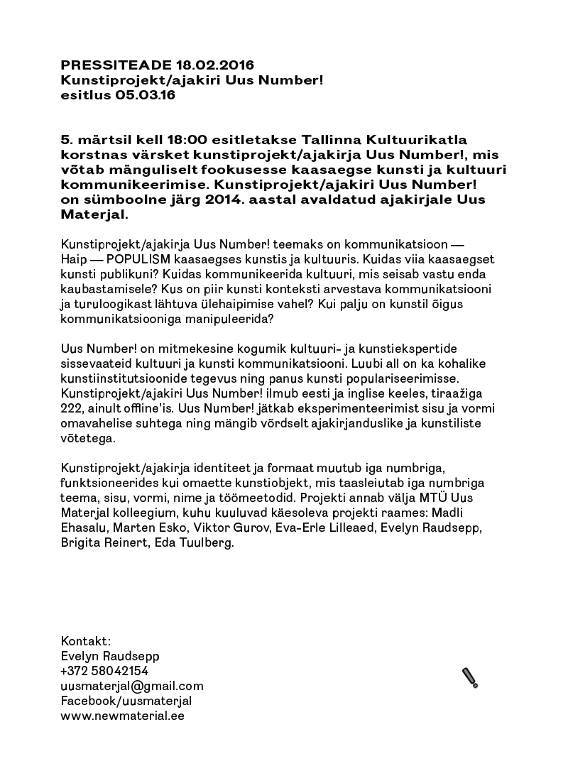 5. märtsil kell 18.00 esitletakse Tallinna Kultuurikatla korstnas värsket kunstiprojekt/ajakirja Uus Number!, mis võtab mänguliselt fookusesse kaasaegse kunsti ja kultuuri kommunikeerimise. Kunstiprojekt/ajakiri Uus Number! on sümboolne järg 2014. aastal avaldatud ajakirjale Uus Materjal.