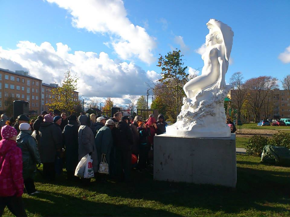 Esimene asukoht: paigutatuna koolihoone esisele laskuva reljeefiga haljasalale ja/või seotuna sissepääsuni viiva trepiga peaks teos aitama linnaruumis esile tuua hoone ajaloolist fassaadi ning viitama kooli ajaloole.